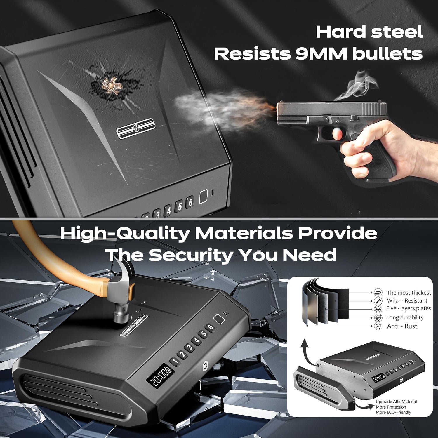 - Advanced Biometric Technology: TOPMEDA gun safe for pistols features state-of-the-art 650 DPI semiconductor biometric fingerprint sensors, ensuring quick and secure verification with high-resolution image capture. The biometric pistol safe stores up to 100 fingerprints for access by multiple users, offering robust security with over 1,000,000 touch capacity.