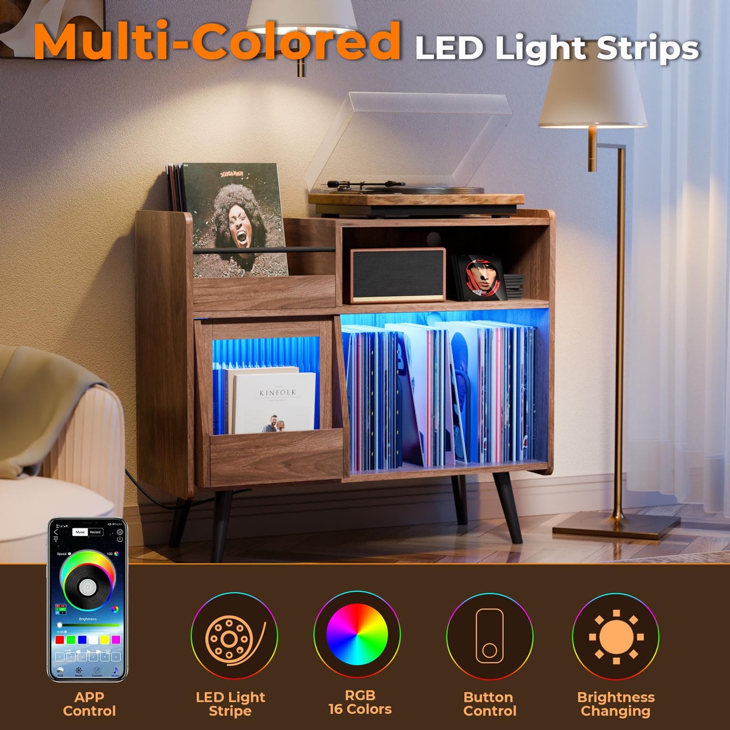 - 【Record Cabinet with LED Lights】This record table is equipped with multi-colour RGB LED light strips, the colours and brightness of which can be adjusted at will via the app. This feature will add a touch of sophistication to your home, creating a romantic atmosphere throughout.