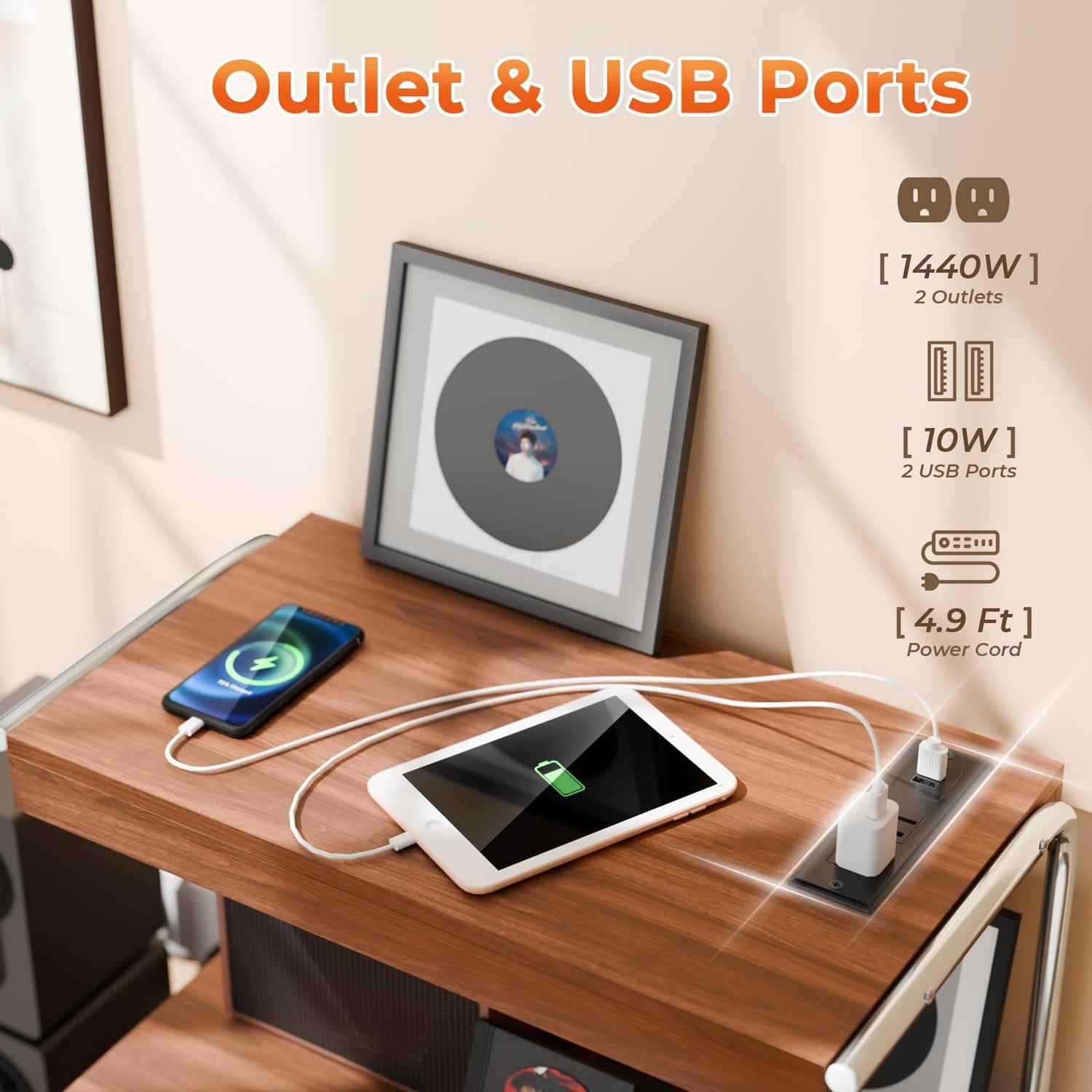 - 【Record Player Stand with Charging Station】This record player table is equipped with a power outlet, offering convenient charging for devices. It features 2 standard plug sockets and 2 USB interfaces, allowing for simultaneous charging of a turntable, audio equipment, and other music devices. This feature enhances convenience, especially in rooms with limited outlet availability.