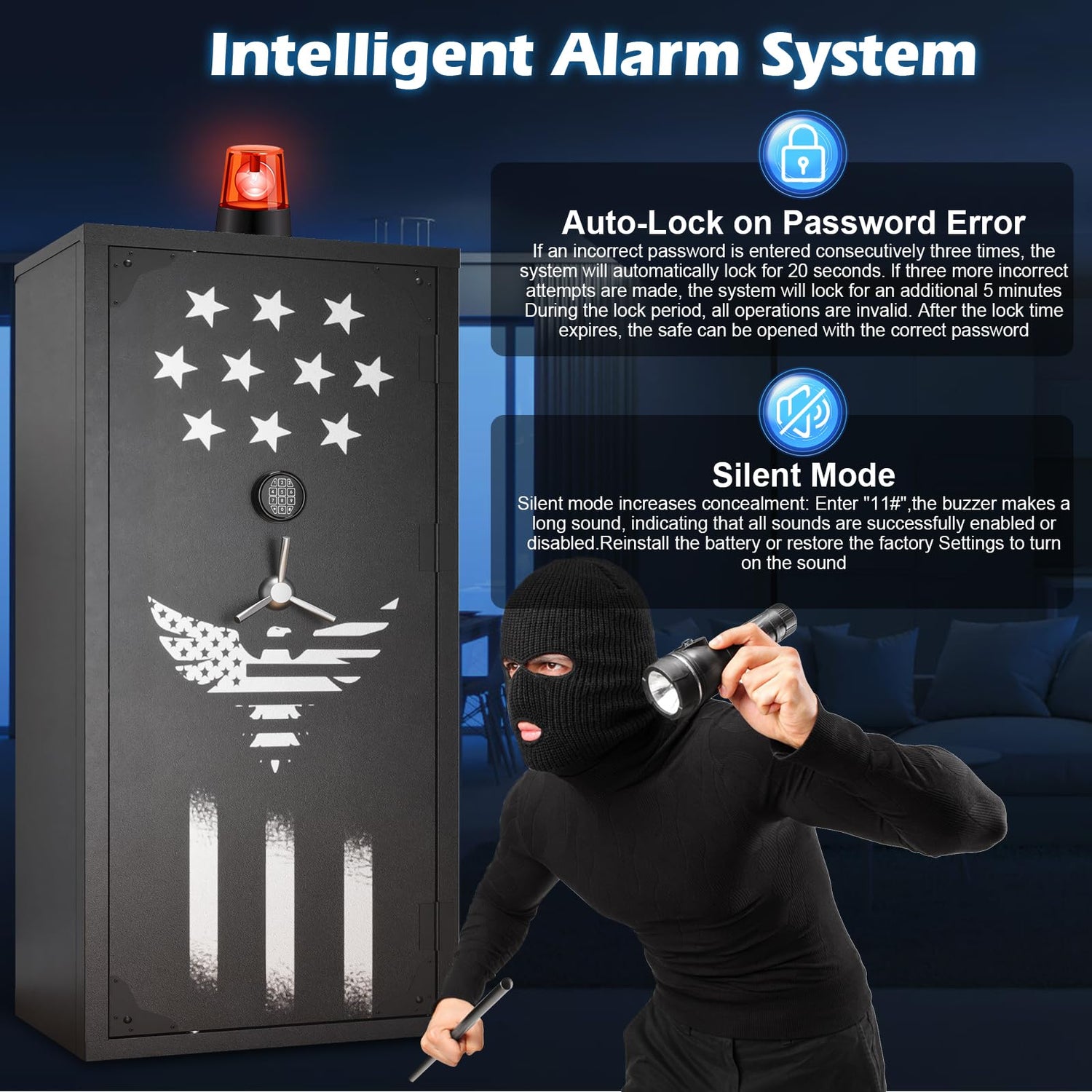 - 【Auto-Lock & Silent Mode & LED Light】: If an incorrect password is entered consecutively three times, the system will automatically lock for 20 seconds.If three more incorrect attempts are made, the system will lock for an additional 5 minutes.Silent mode increases concealment.When you enter the code to enter the gun cabinet, the LED light will come on.Also has a magnetic lamp to help illuminate the night.