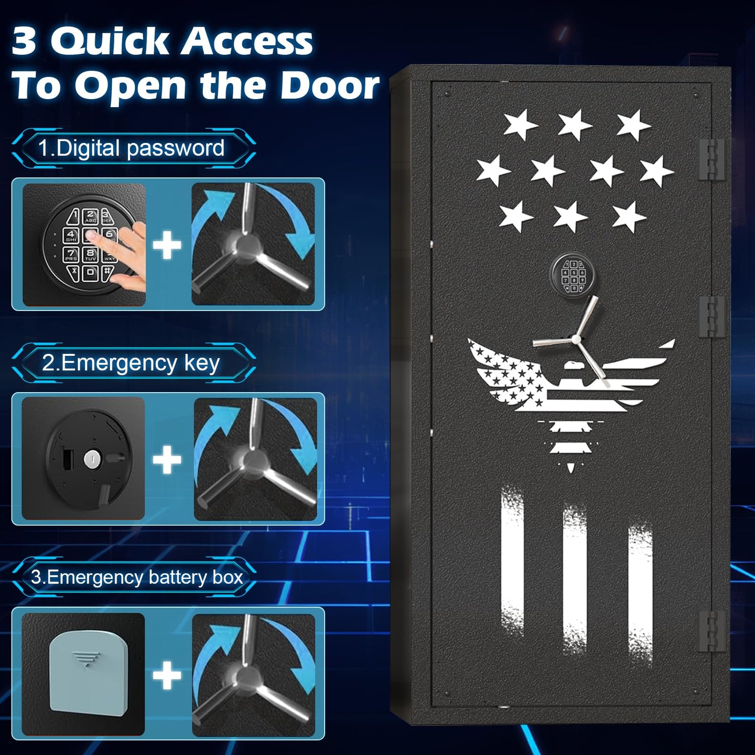 - 【3 Quick Access& External Battery &180-Degree Full Access Door】: 3 ways to quickly enter the gun safe for rifles and pistols: Digital password to enter; If the battery voltage is insufficient, the emergency key or external battery box can be used to operate.The keyhole and external battery port is behinds the key panel.The safe features a 180-degree full access door, which provides a wide and unobstructed opening for easy retrieval of your firearms and enhances accessibility and convenience.