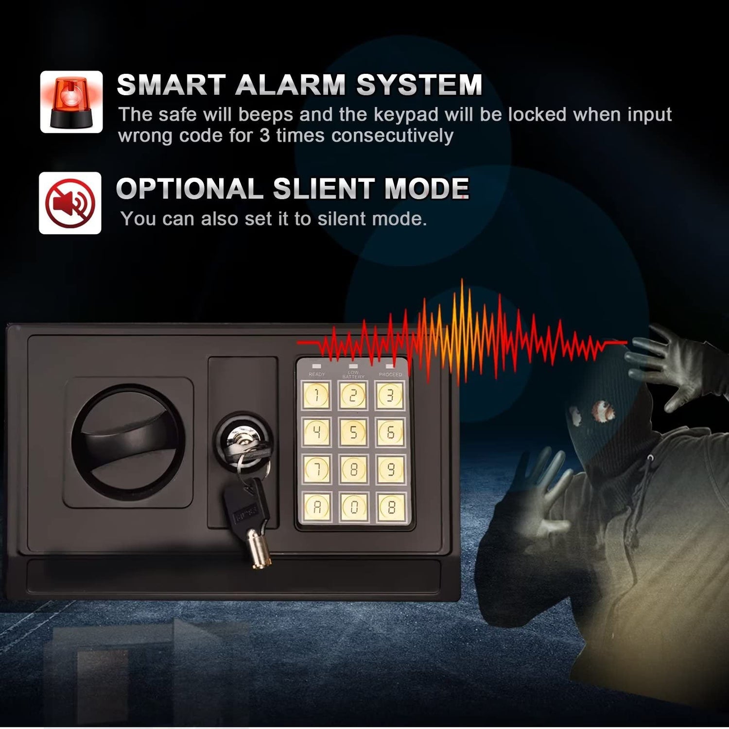 - ✅【Wrong Access Alarm, Silent Mode】The safe will beeps and can't get access by PIN code if wrong access for 3 times. Also you can also turn off the sound. It is important function when you have introducer at night or you want to use the safe without distubing others.