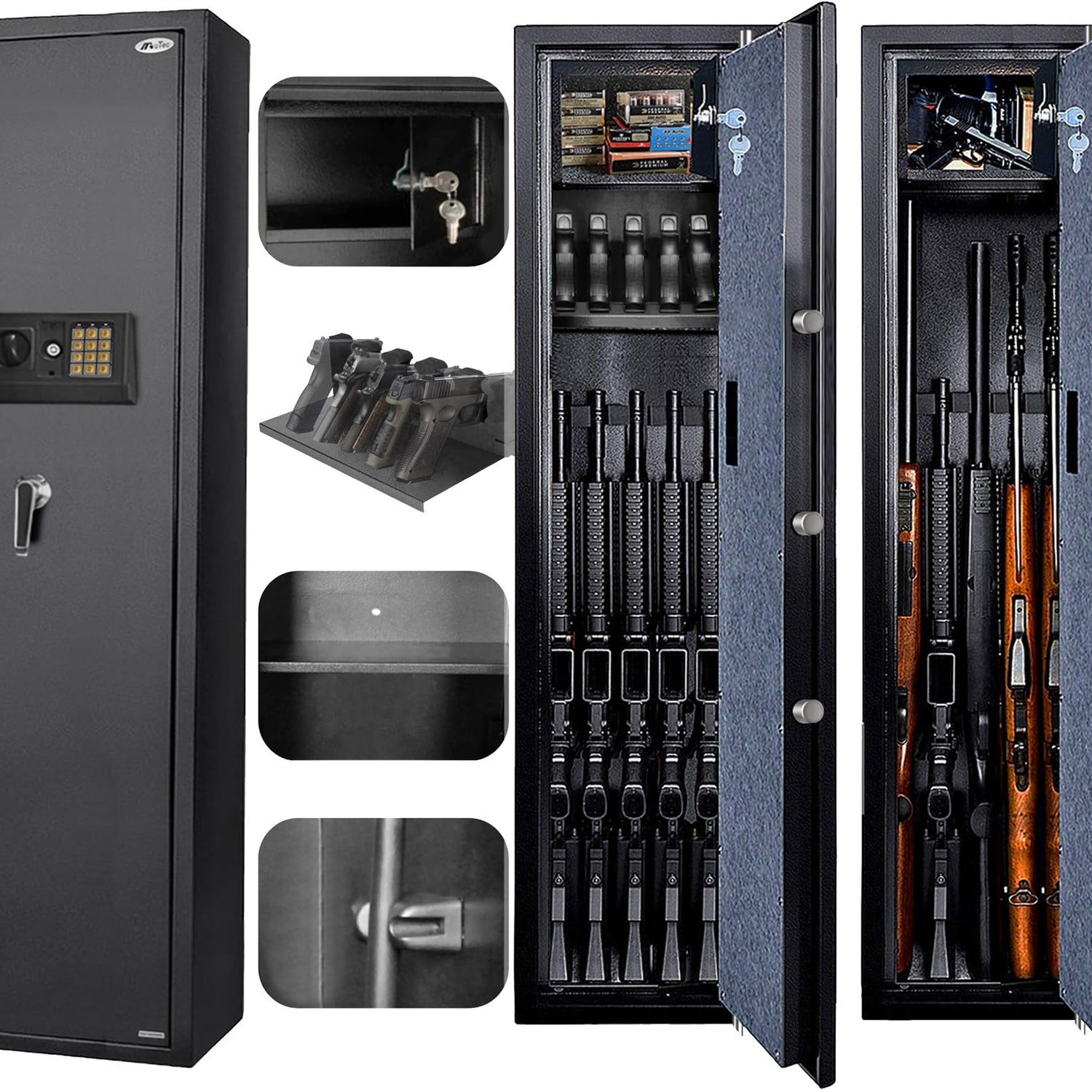 - ✅【Larger and Deeper Safe with Separate lock box】The safe is Larger and deeper safe stores up to 5-6 rifles /shotguns up to 50inches with/without scopes, Deeper than safes only 11inch and can't fit scoped rifles. It also has a separate lock box inside to store small guns and other valuables in your home or office. Exterior Dimensions: 13.8”(w) x 12”(d) x 57”(h).