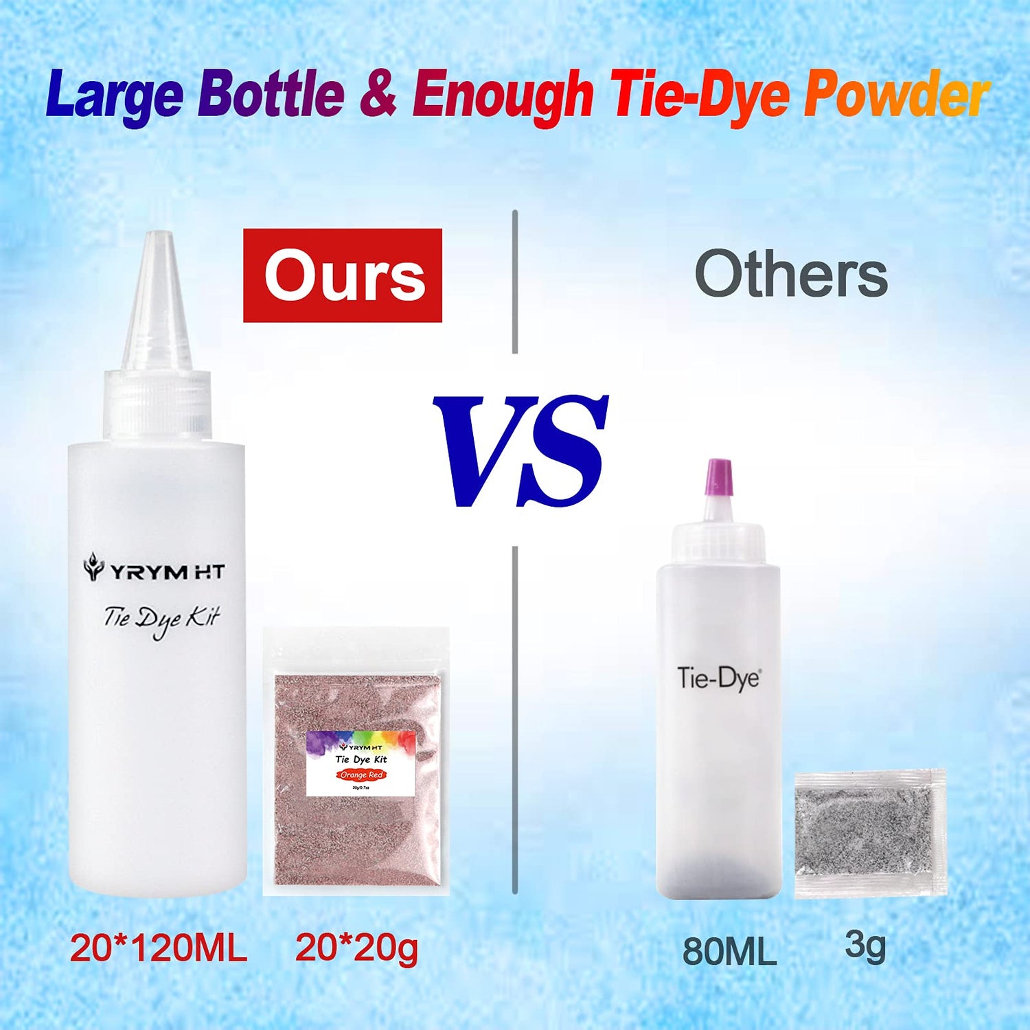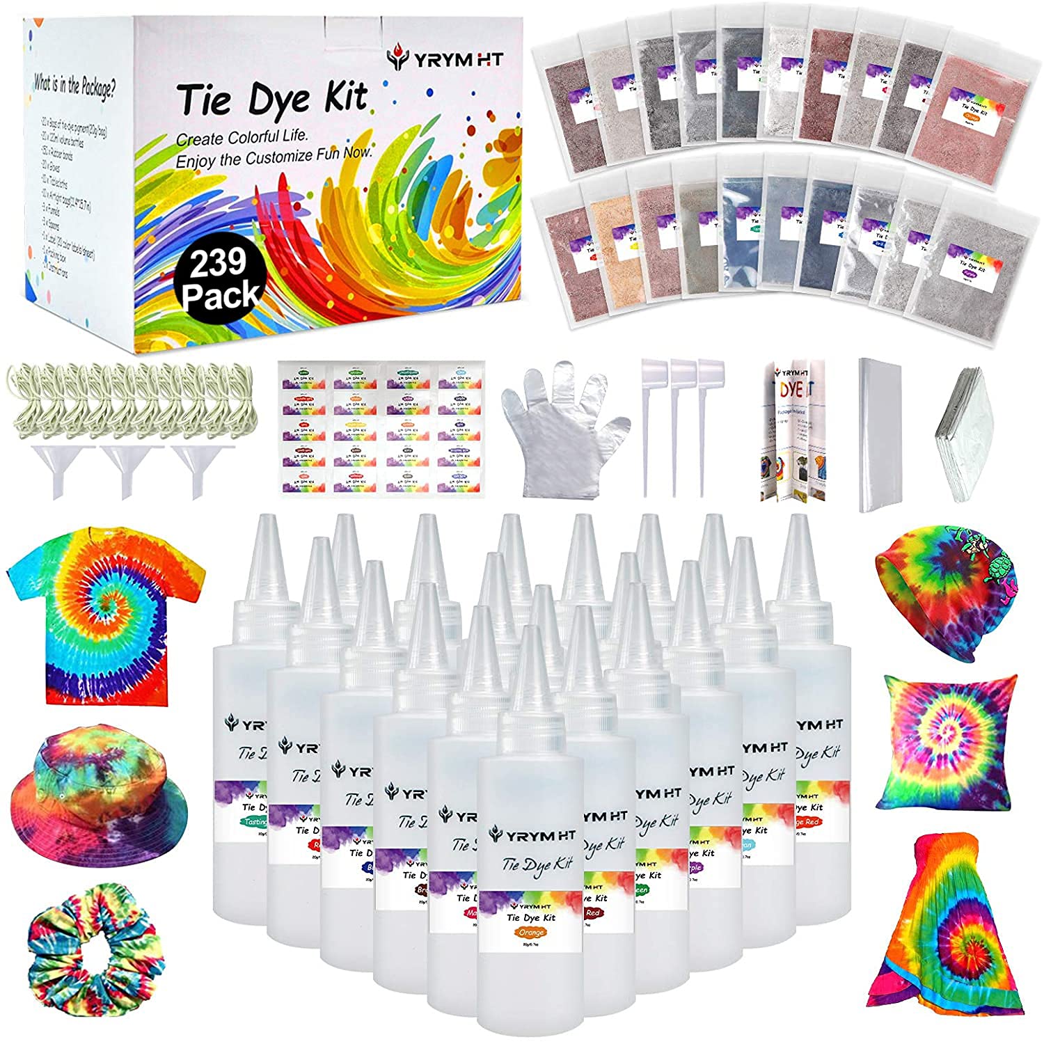 - 239 PACK LARGE CAPACITY KIT: Our large tie dye kit for kids including 20pc squeeze bottles(120ml), 20 bags of tie-dye pigment(20g), 199pcs tie dye kit operating tools. No need to seek dazzled gadgets on market any more, you will get everything to start dyeing fabric with YRYM HT tye dye kit. Large capacity allows you dyeing up to 60 medium adults T-shirts depending on thickness, design, so you can dye whatever you like and create your own colors by mixing different color together