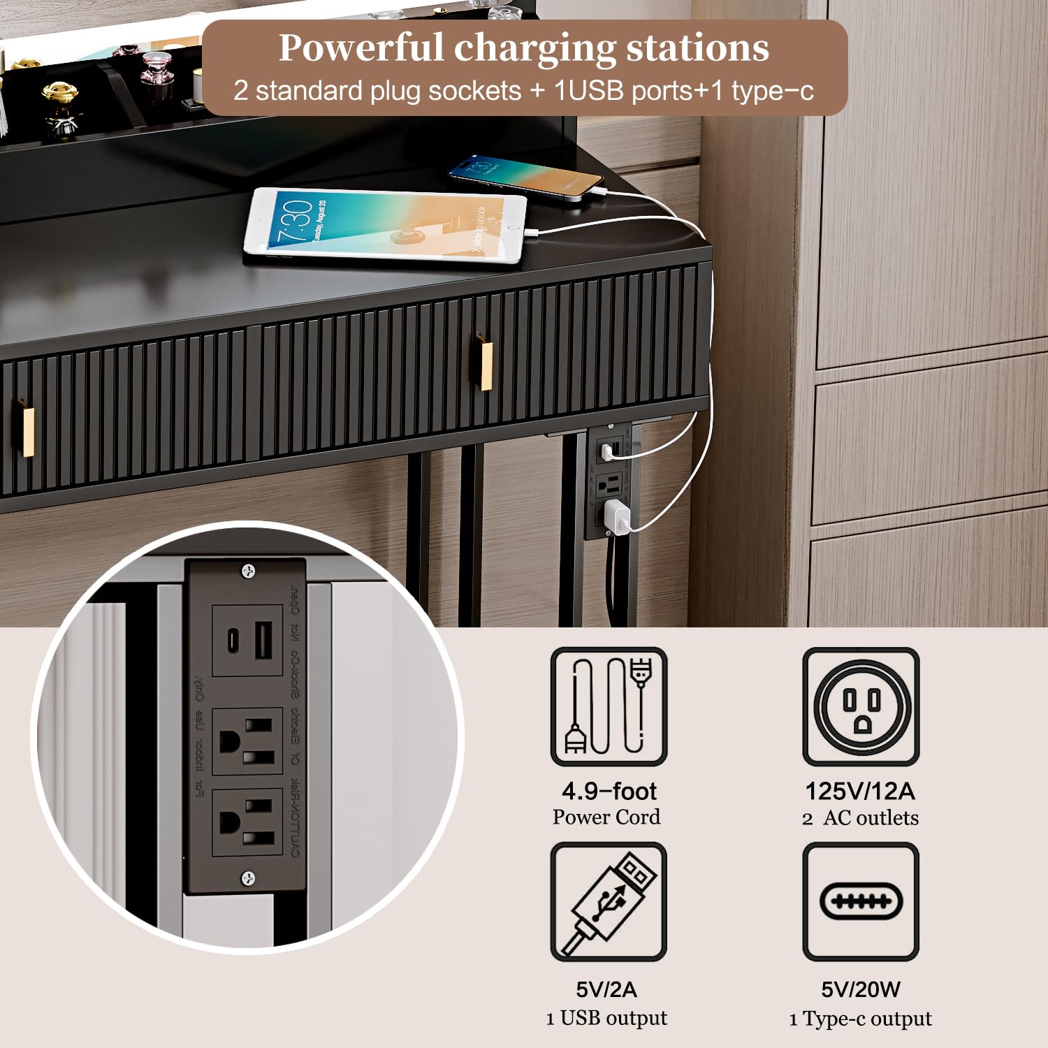 - 【Built-in Power Strip】Upgrade design!This makeup table equipped with a power strip that has 2 standard plug sockets ,1 USB ports and 1 T-C with a 4.9-foot power cord,convenient for the LED lights,hairdryer, curling iron, and charge your phone, tablet, or other electronics.