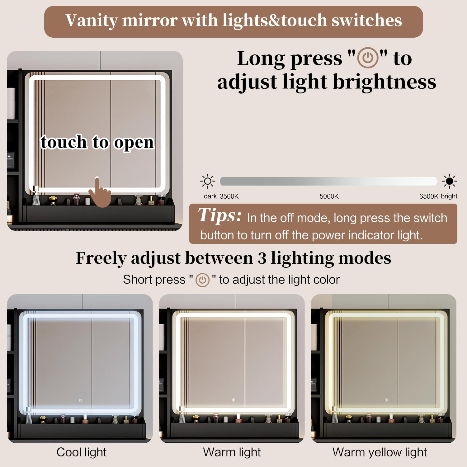 - 【3-Color LED Light】The vanity desk has a large dimmable lighting mirror with 3 different LED lighting colors, including natural, warm and cool light, for a variety of indoor lighting and environments to optimize your makeup