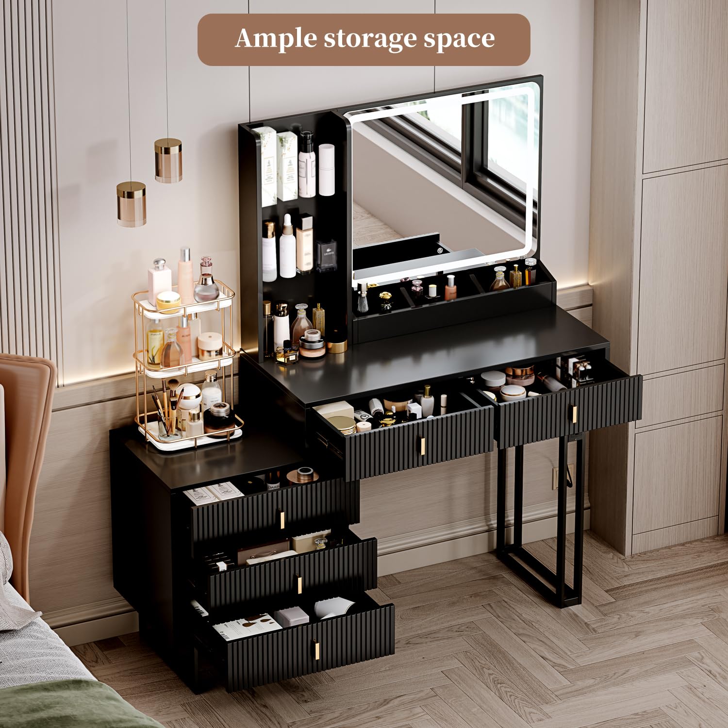 Large Vanity Desk with 3 Color Touch Screen Dimming Mirror, Vanity Desk with Charging Station, Modern Retractable Makeup Dressing Table, Vanity Table With storage shelves and 5 Sliding Drawers, Black