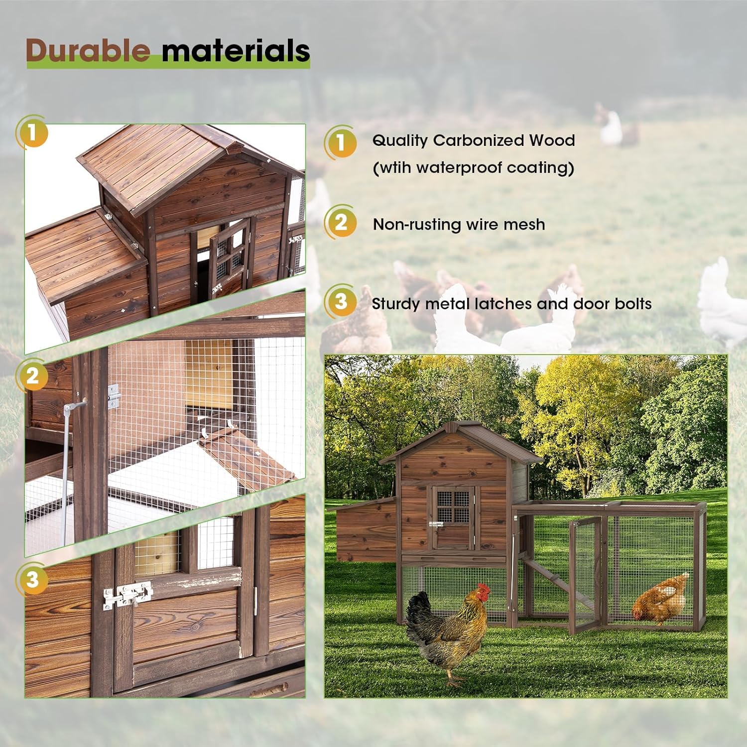 - 【Sturdy & Weatherproof Wooden Chicken Coops】The wooden chickens coop run is made of high-quality thick wood, which is waterproof and sun-resistant for constant outdoor use. Wooden roof can protect the pets from rain/wind/snow and provide a comfortable sleeping atmospher.