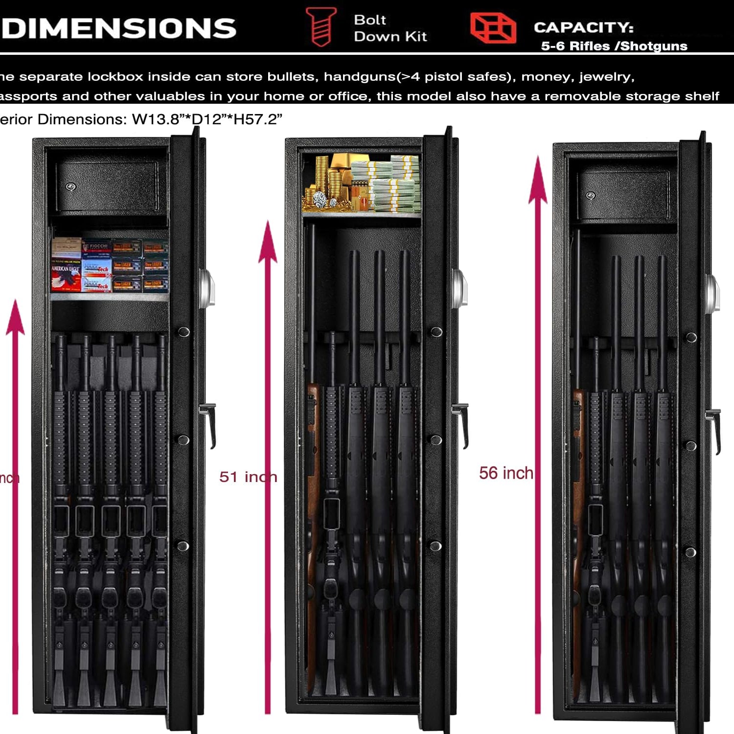 Larger and Deeper Rifle Safe, New and Improved Gun Safe for 5-6 Rifles and Shotguns for Home, Quick Access Gun Cabinet (w or w/o Scope) with Lockbox Silent Mode