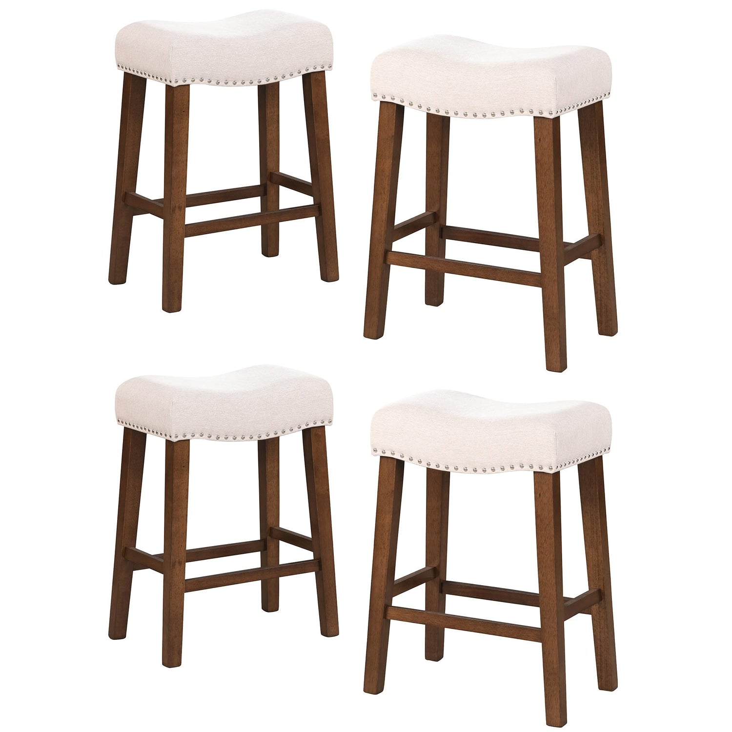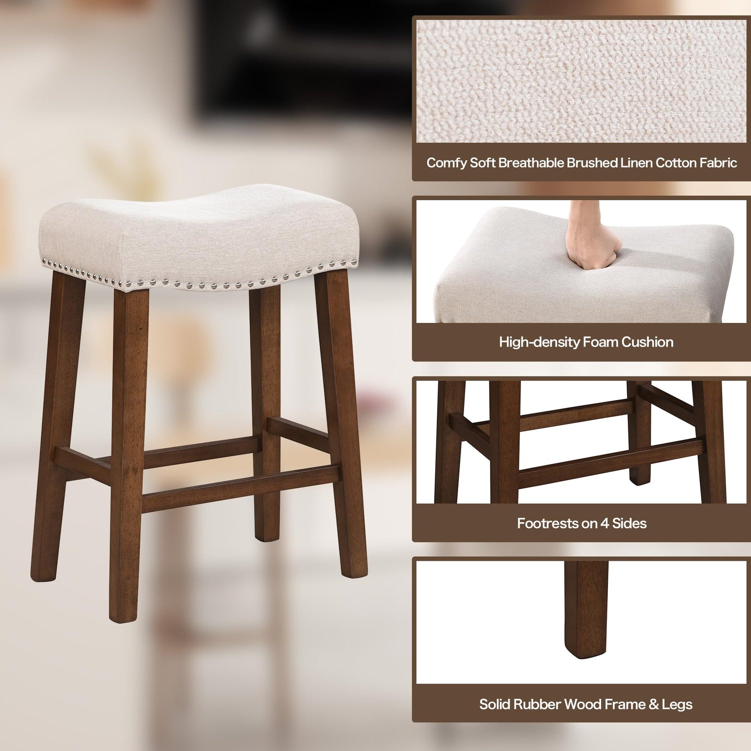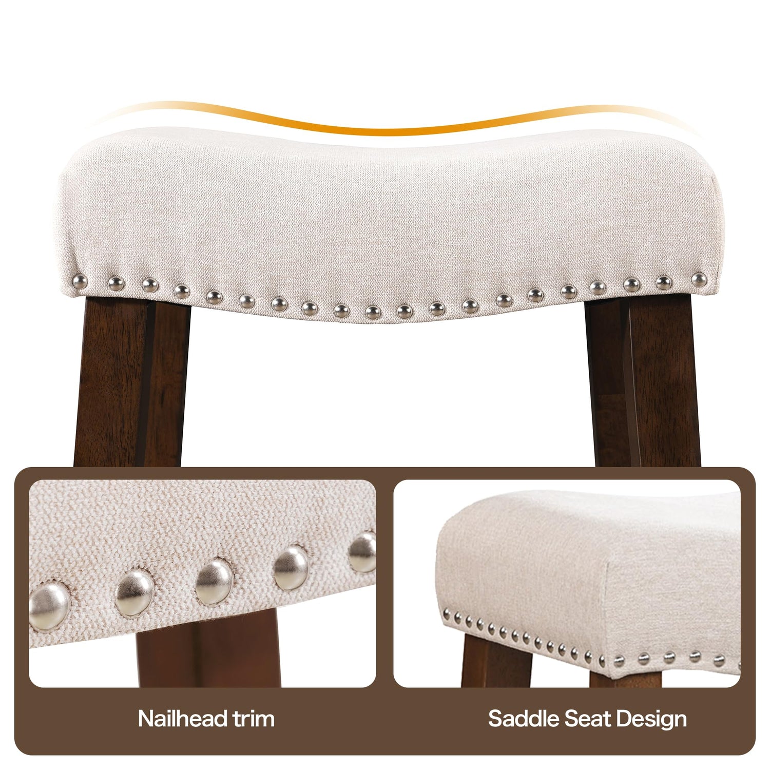 Larksperal 26" Counter Height Bar Stools - Modern Backless Kitchen Island Saddle Barstools Chairs with Footrest, Solid Wood Legs & Nailhead Trim Linen Fabric Cushion, Beige, Set of 4