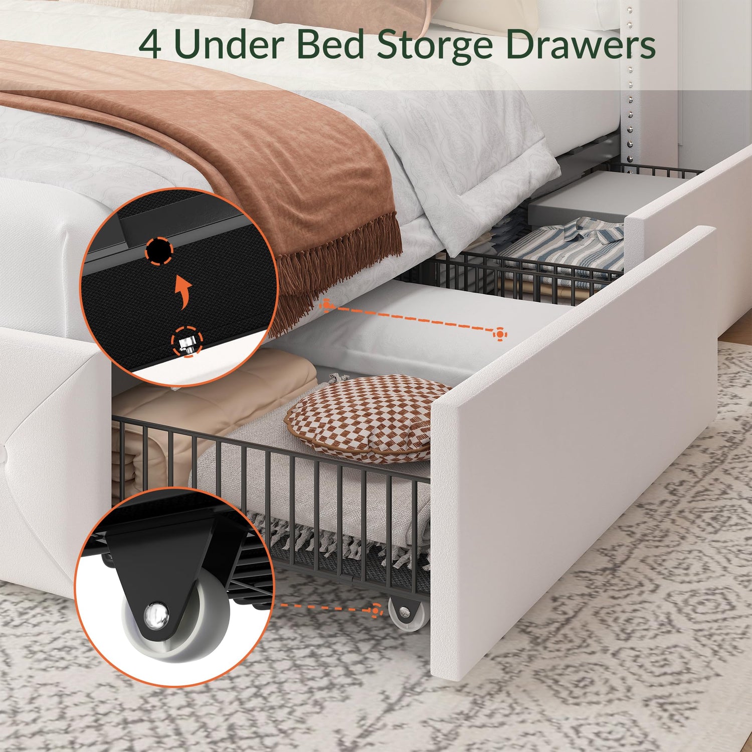 - 【Large Storage Capacity with 4 Drawers】 Queen bed frame with drawers provide ample storage space for your belongings; The wheels make it easy to slide the drawers in and out, so you can access your items without any hassle; Queen bed frame with storage not only helps you keep your bedroom organized but also maximizes the use of space in your room