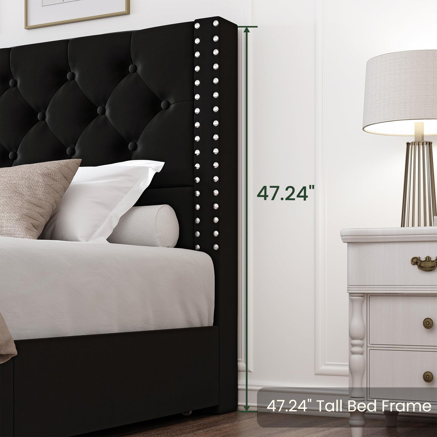 LARMACE Queen Size Upholstered Bed Frame with Storage Velvet Platform Tufted Bed Frame with 4 Drawers and Headboard, Wood Slats Support, Easy Assembly, Noise-Free, Black