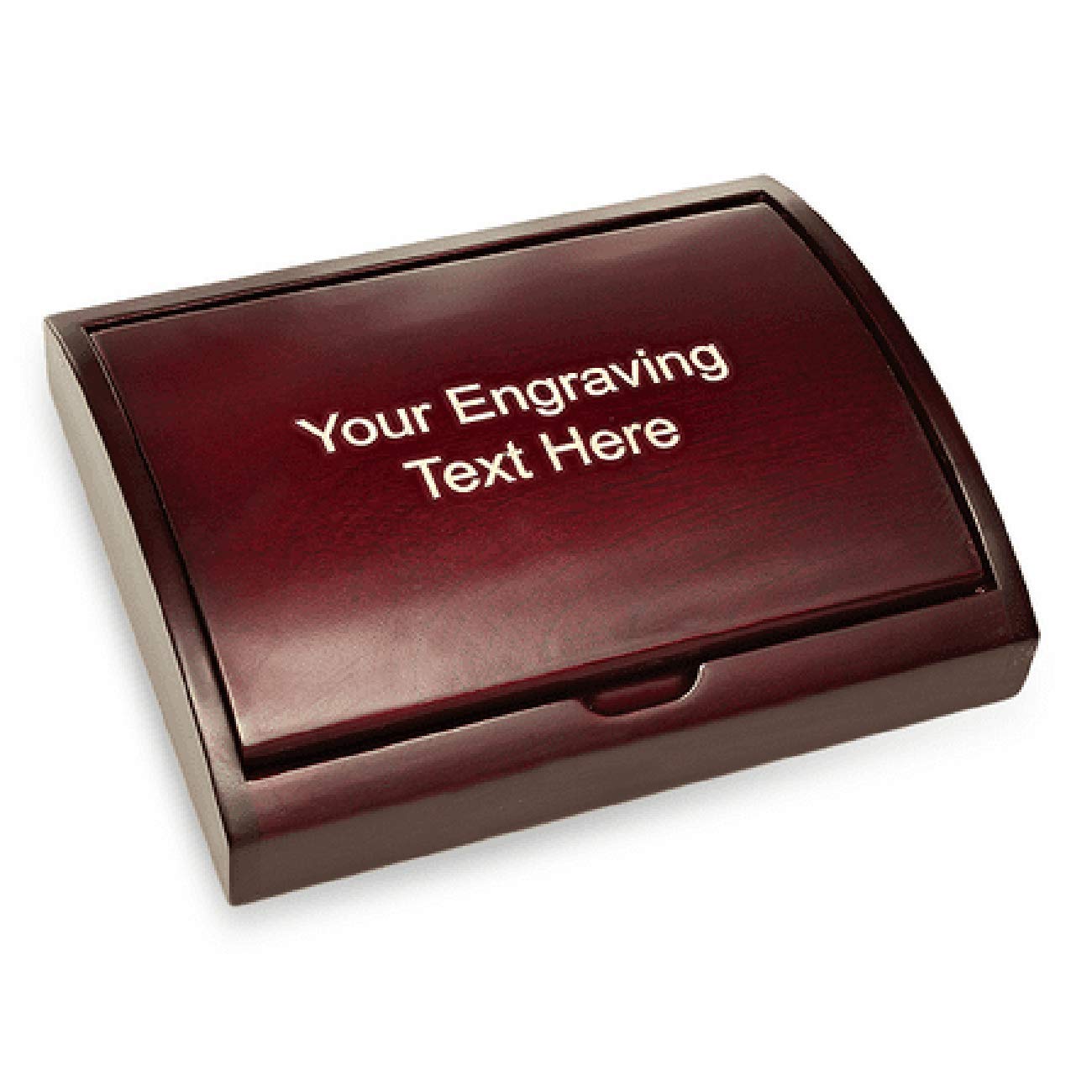 This cherry finished wooden gift set features all the writing instruments you'll ever need, a ballpoint pen, a rolling ball pen and a mechanical pencil. The 2 pens and 1 pencil are coated in a black lacquer and feature brass colored accents. All of the items in this personalized pen and pencil desk set are held securely in place with a foam lined interior. We'll be happy to add a free laser engraving to the top of the arched wooden gift box and/or the pens & pencil inside for a great personal touch. Includes a ballpoint pen, a rollerball pen and a mechanical pencil Presented in a cherry finished wooden gift box Free personalization, check the box above to enter instructions Packaged in gift box Dimensions: 6 7/8" x 5 5/8" x 1 1/2"
