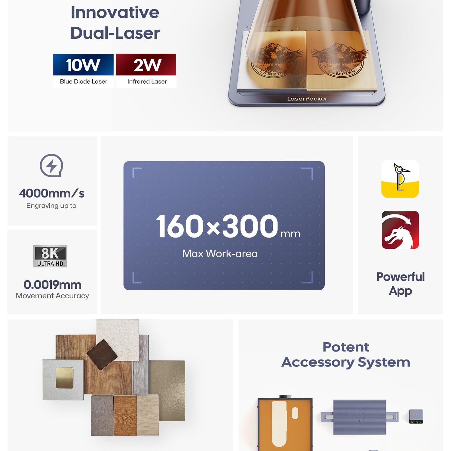 - One Machine for Almost All Materials: Infrared laser + Diode laser integrated, LaserPecker LP4 can engraver on almost all of the materials. Infrared laser for all metals and plastics; Diode laser for wood, leather, glass, ceramics etc.; Cutting 8 mm wood and 5 mm acrylic. Besides, you can even do rust removal and overglaze