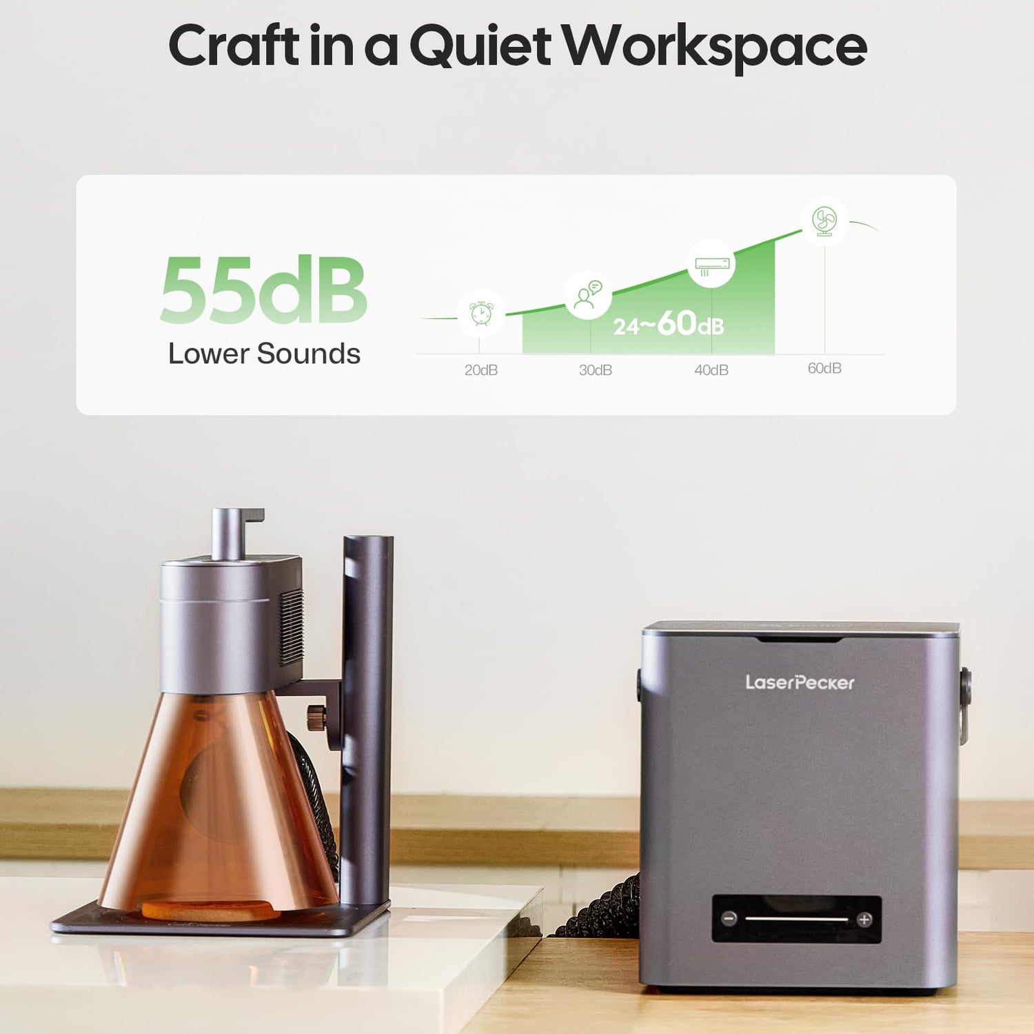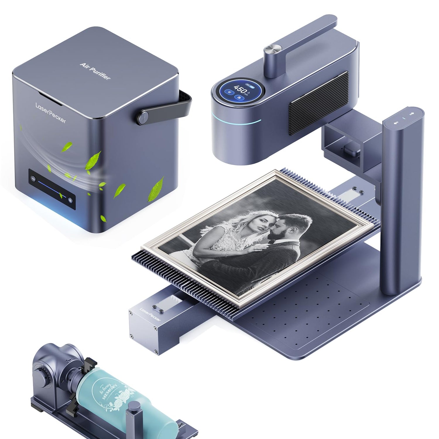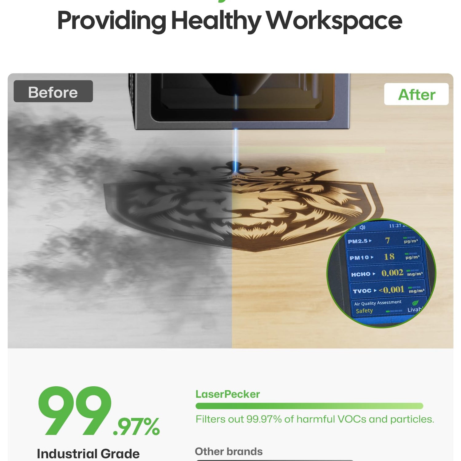 - The Most Productive Set for Business: Includes LaserPecker LP4 Laser Engraver, Air Purifier, Slide Extension, and Rotary Extension - Perfect for Efficient and Clean Batch Processing. The LaserPecker Desktop Air Purifier is designed to provide a quiet and highly efficient air purification experience and is perfectly compatible with all LaserPecker machines. It features a 4-layer filtration system, achieving a 99.97% purification rate