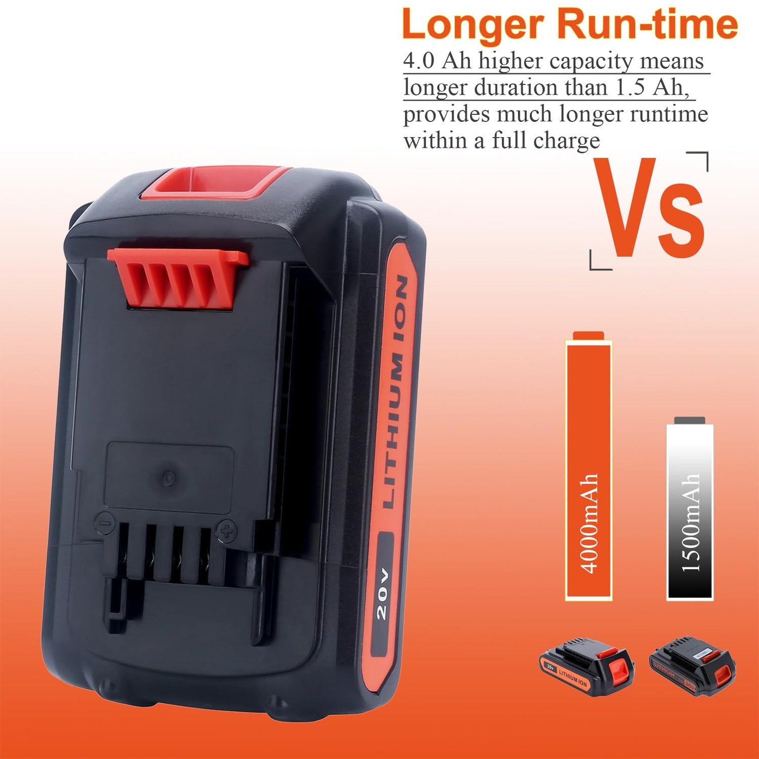 - đăCapacity UpgradedăCapacity: 4000mAh | Battery type: Lithium | Voltage: 20 Volts | Wattage: 80Wh | Package: 2 Pack | Replacement battery compatible with Black and Decker 20v Max outdoor power tool battery.