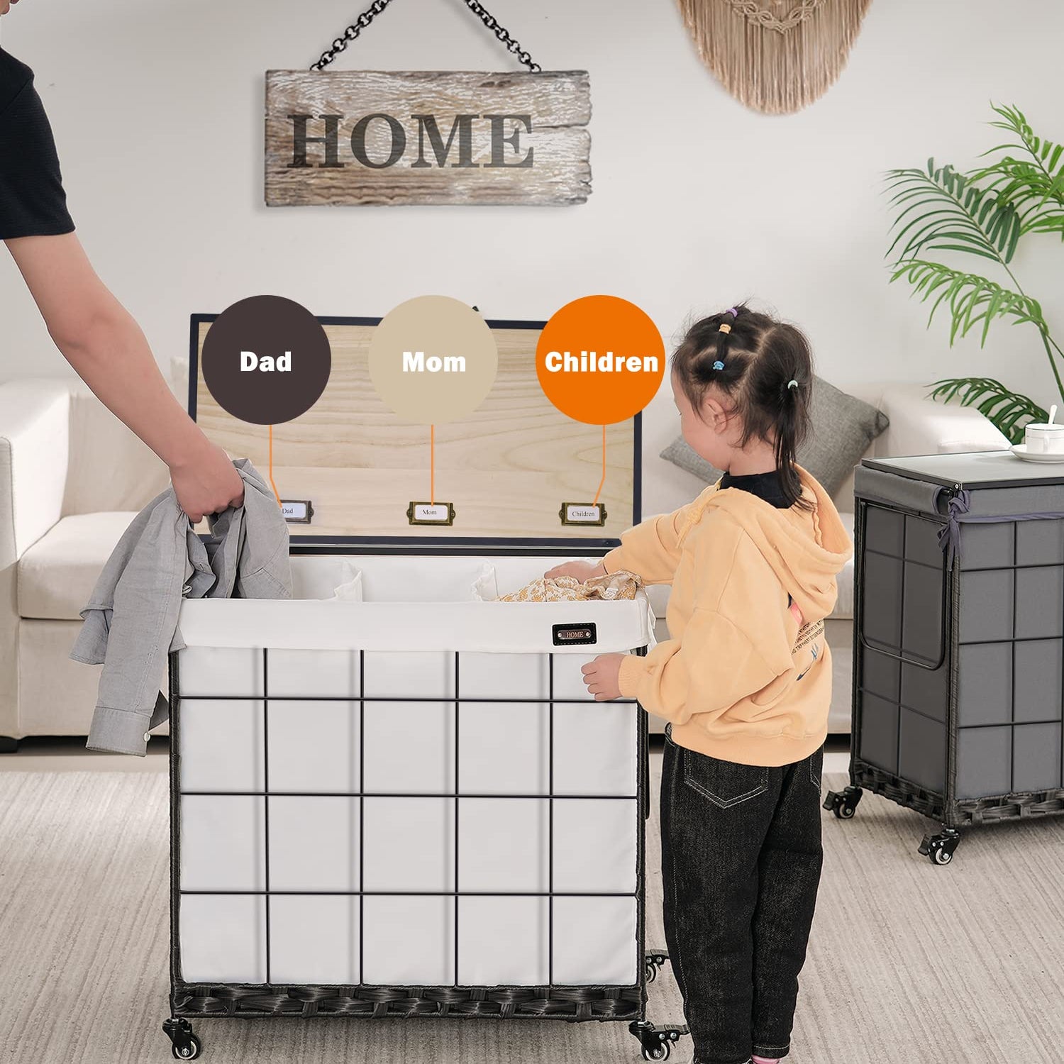 - ♡【 Worried about that the various laundry are mixed up? 】 Please do not worry. The liner bag of clothes hamper is designed with 3 compartments that make sorting laundry simple, saving time and effort. More importantly, our clothes hamper is with DIY labels, so you can mark some labels on the back of lid (for example "Dad’s, Mom’s, Children’s") and then you can easily sort laundry as you prefer. In addition, the liner bag is removable, and machine washable when it is dirty.