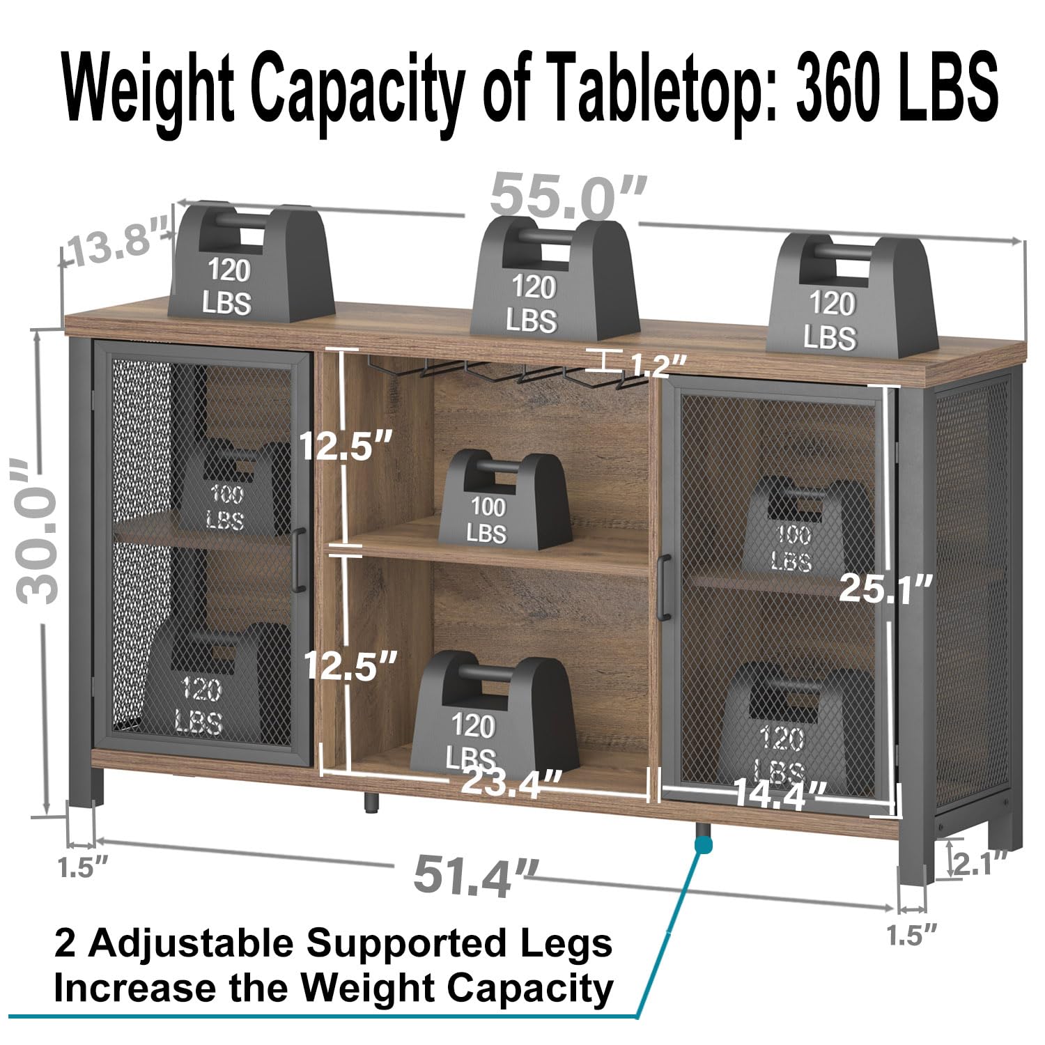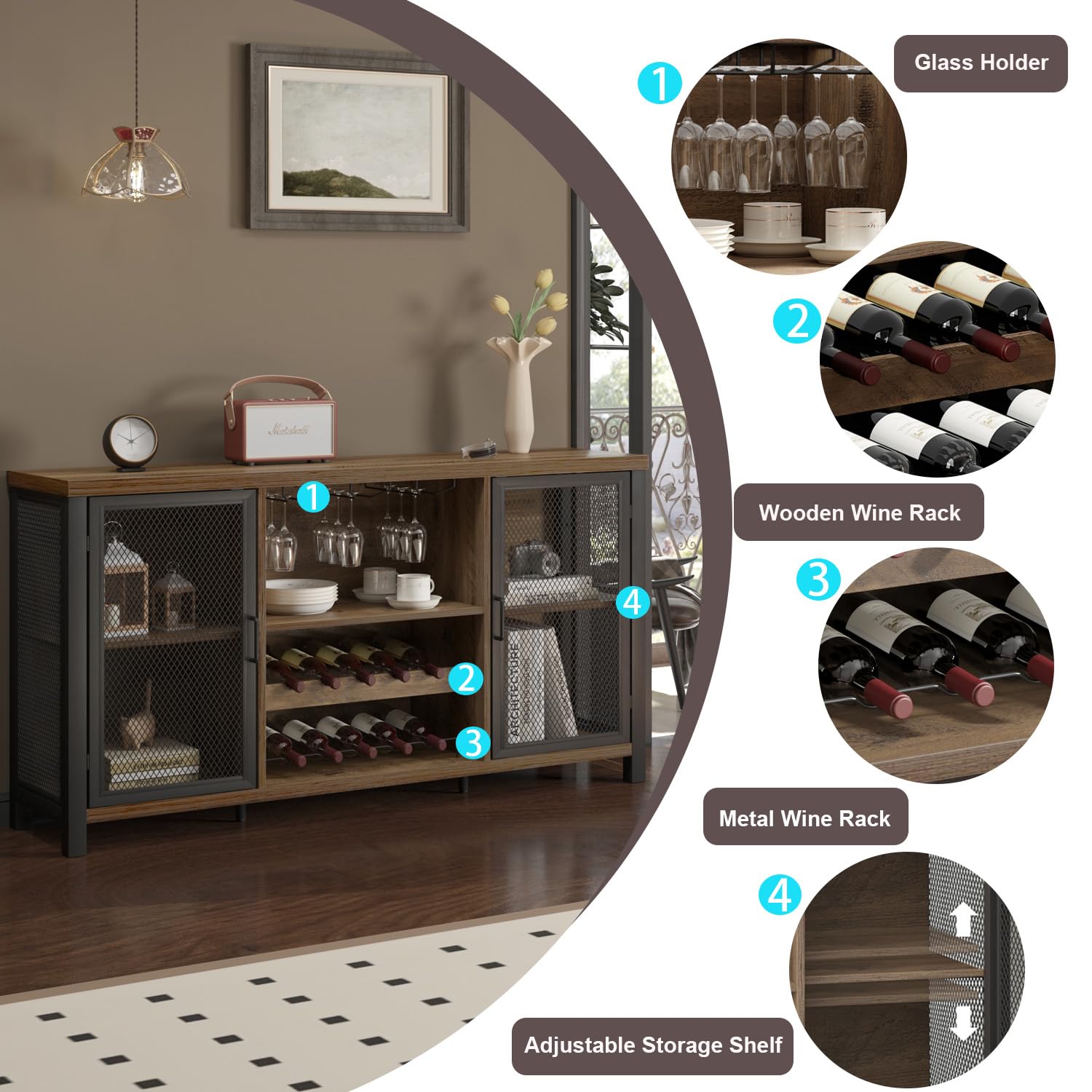 Launica Wine Bar Cabinet, Industrial Coffee Bar Cabinet Farmhouse for Liquor and Glasses, Sideboard Buffet Cabinet with Storage Rack for Home Kitchen Dining Room, Rustic Oak, 55 In