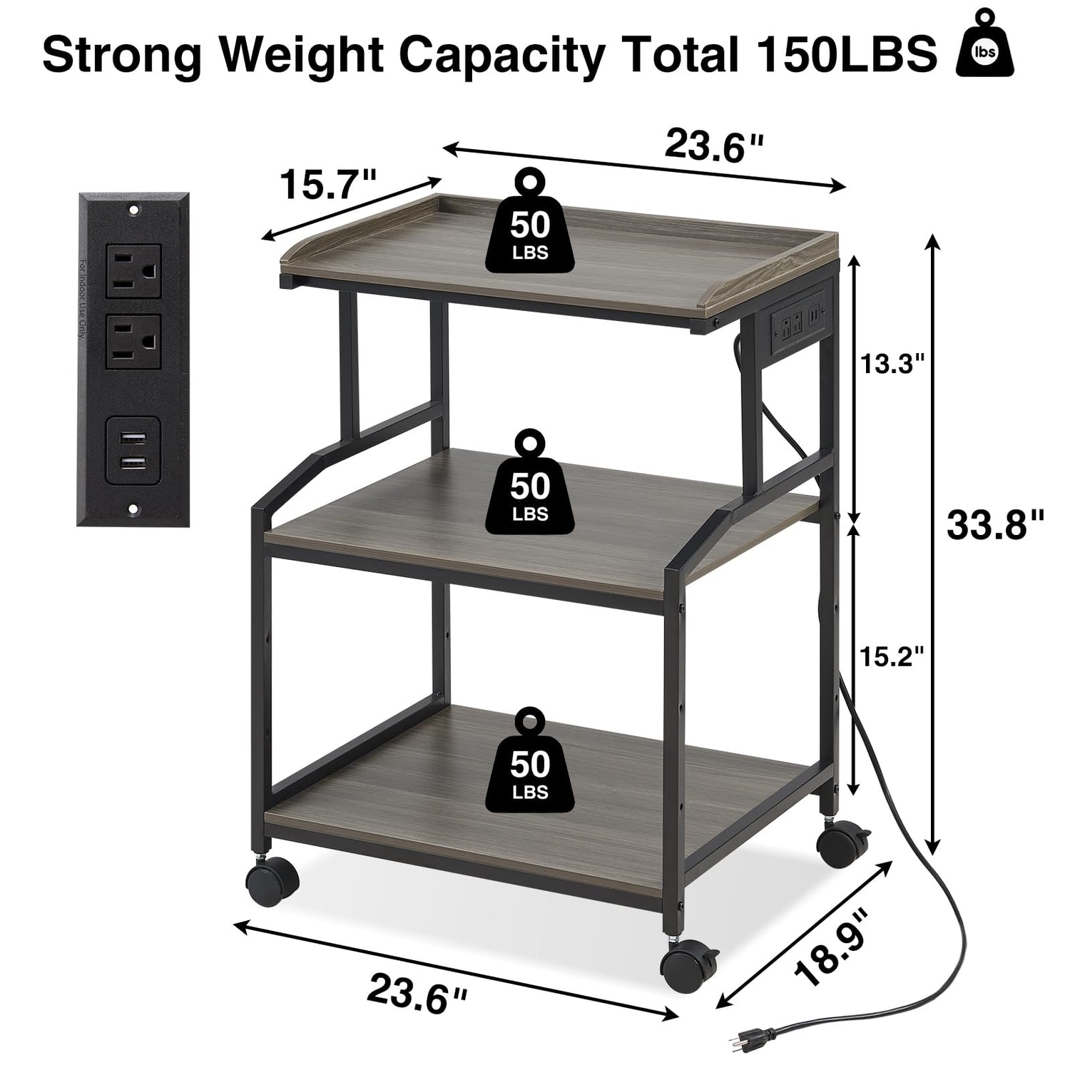Lauren&Harold 3-Tier Printer Stand with Storage Printer Table with Charging Station and USB Ports, Rolling Printer Cart with Adjustable Shelf, Large Printer Stand with Wheels for Home Office