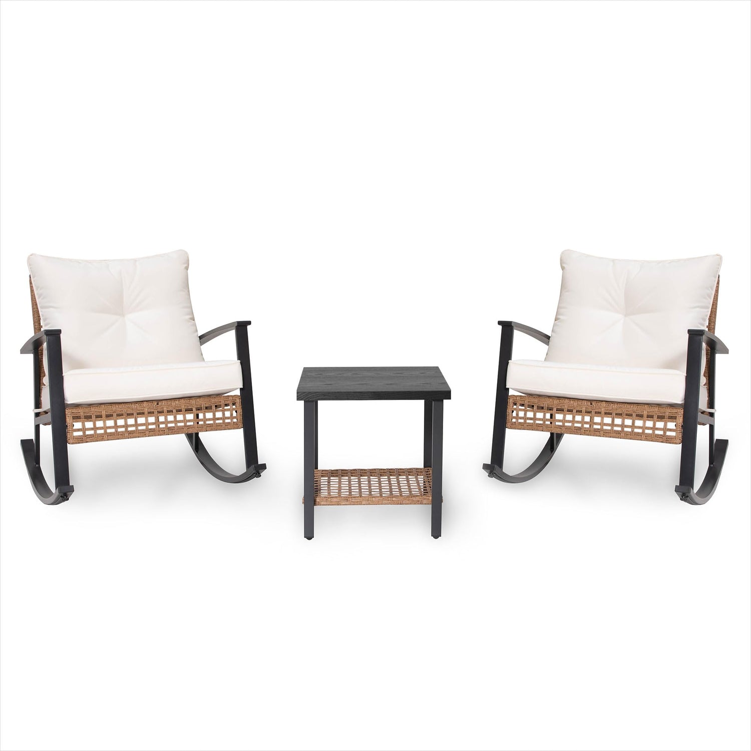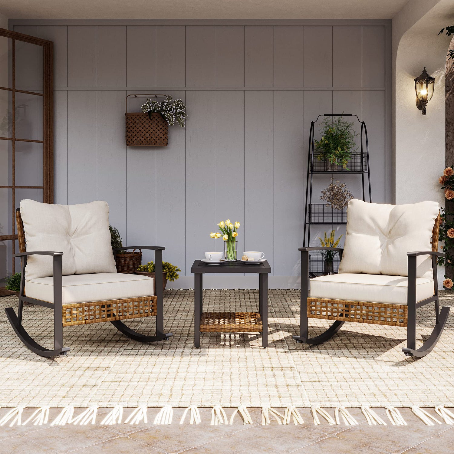 - 【Durable Metal & Rattan Frame】Compared with other ordinary rattan, the frame of this patio bistro set is made of sturdy metal and rattan material. The widened rattan has a hollow design, which is simple and fashionable. Additionally, the powder-coated metal rocking chairs and tables are built to be rust-resistant. This patio wicker rocking chair set can withstand rain, sun exposure, and wind effortlessly.