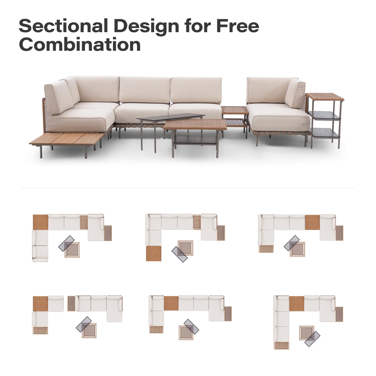 - Versatile Design and Storage Solution: Our outdoor set features a versatile modular design and includes four uniquely shaped multi-functional coffee tables along with a three-tiered storage console. This design not only allows for customized seating arrangements but also adds sophistication to your outdoor space while providing ample storage options.