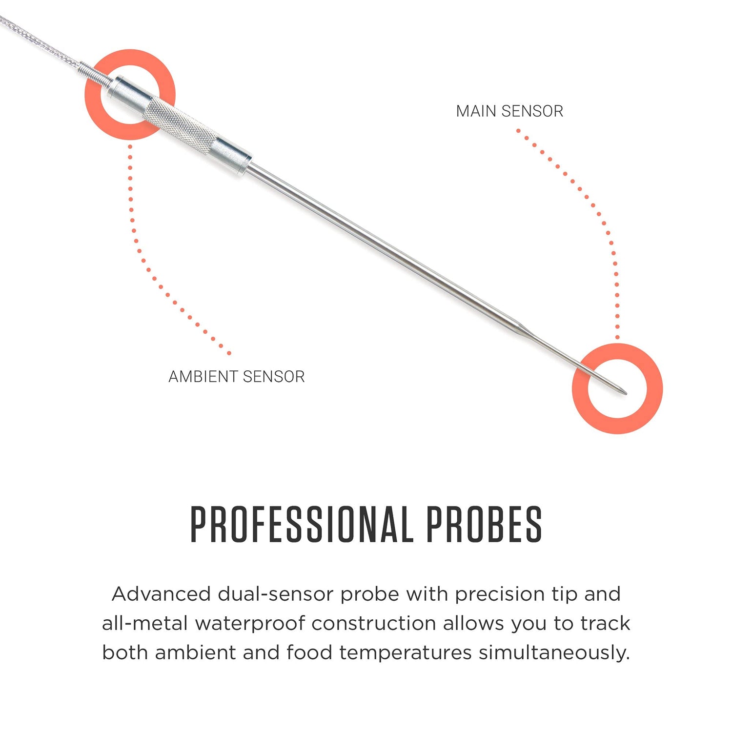 - Advanced dual-sensor probe that tracks both food temperature and the temperature of your oven or smoker.