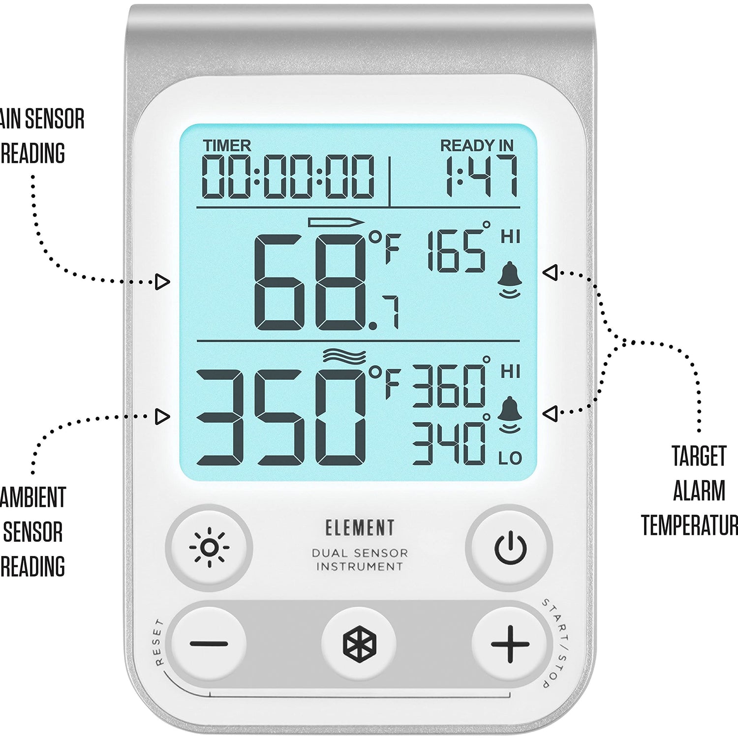 Details: The Most Advanced Wired Oven Thermometer The Lavatools Element oven thermometer is designed to help you to monitor and know when your food is ready. With a "ready-in" timer, you'll know exactly when you food will be done. Along with additional stopwatch and timer alarms, you'll achieve award-wining results while entertaining your guests. Built for Professional Use Element is built with the same care and precision that goes into all Lavatools products. With an advanced all-metal dual-sensor probe that could simultaneously measure both the food and ambient temperatures, Element is the ultimate cooking companion for everybody from the pitmaster to the kitchen novice. One Tool with Multiple Styles Whether you’re grilling, roasting, or smoking, Element let's you monitor the internal temperature, ensuring perfect results. Specifications - Tip sensor range: -40~572°F (-40 ~ 300°C) - Ambient sensor range: -4~572°F (-20 ~ 300°C) - Battery: 2x AAA - Battery Life: 4,000+ hours - °F/°C Configurable Lavatools is a proud Californian company and all our wireless thermometers are certified by CE, FCC, and RoHS.