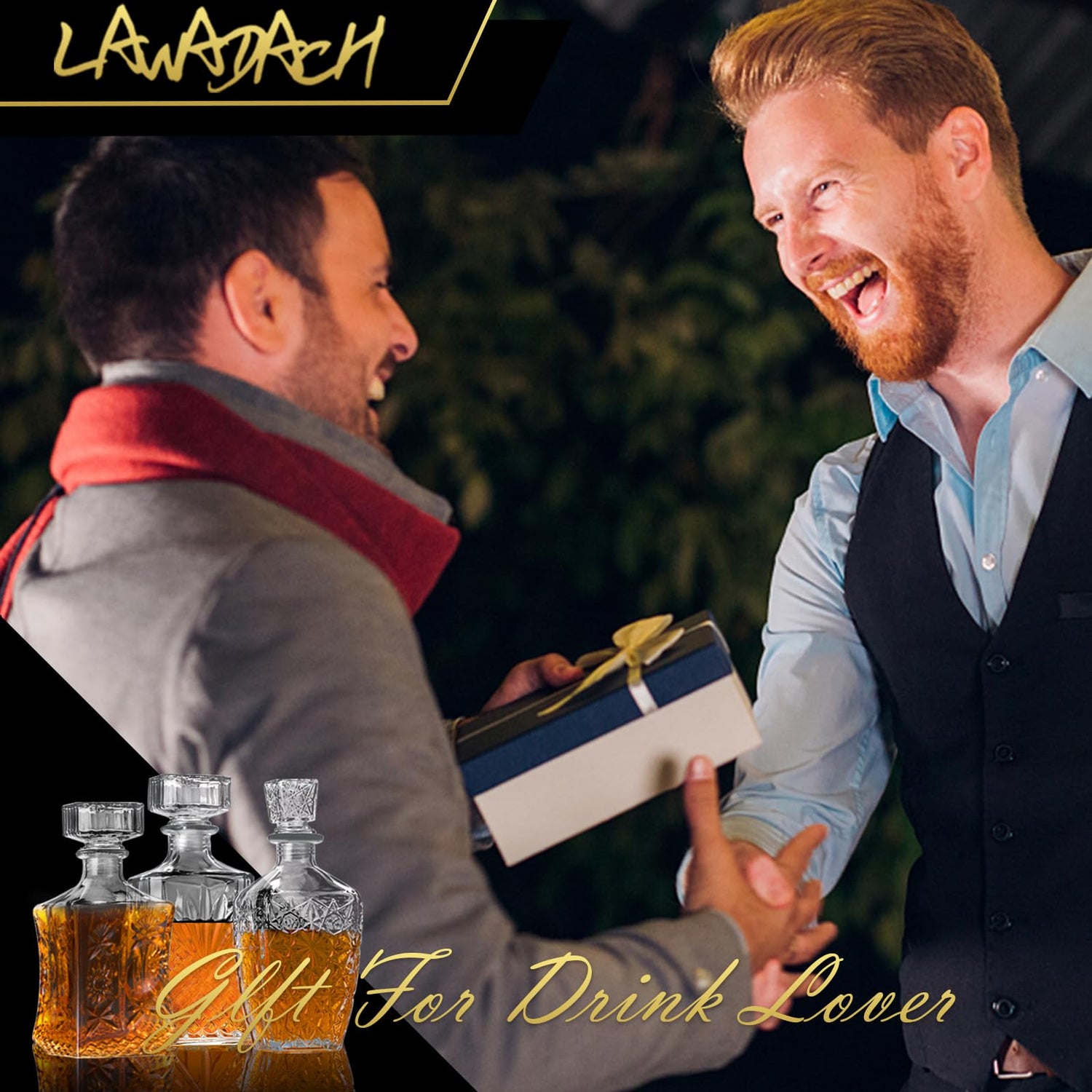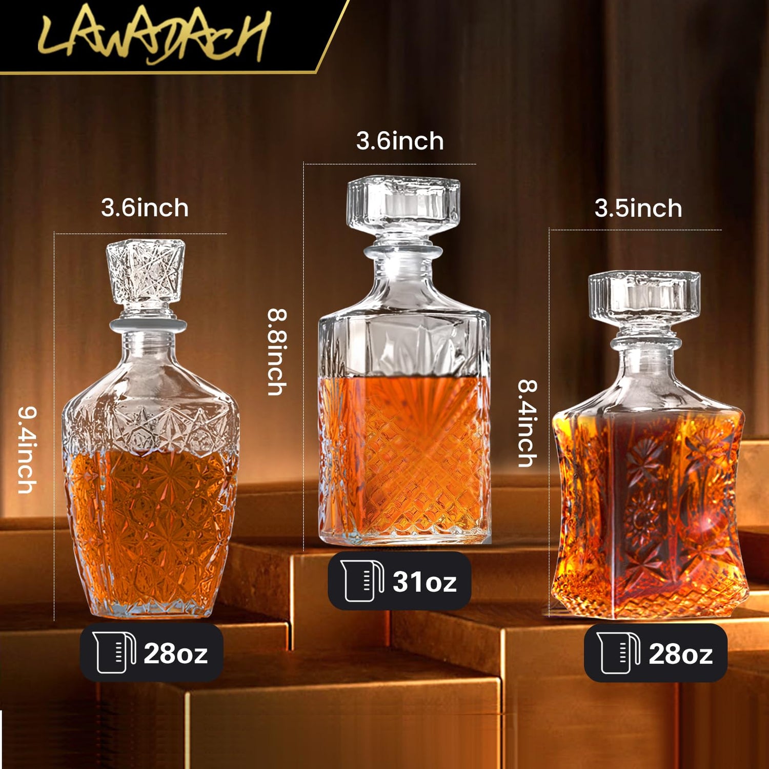- 3 Different Design - LAWADACH whiskey decanter set consist of one 31oz and two 28oz glass bottles with different pattern.They are the ideal size for storing your favorite spirits, such as whiskey, tequila, bourbon, vodka, scotch and so on
