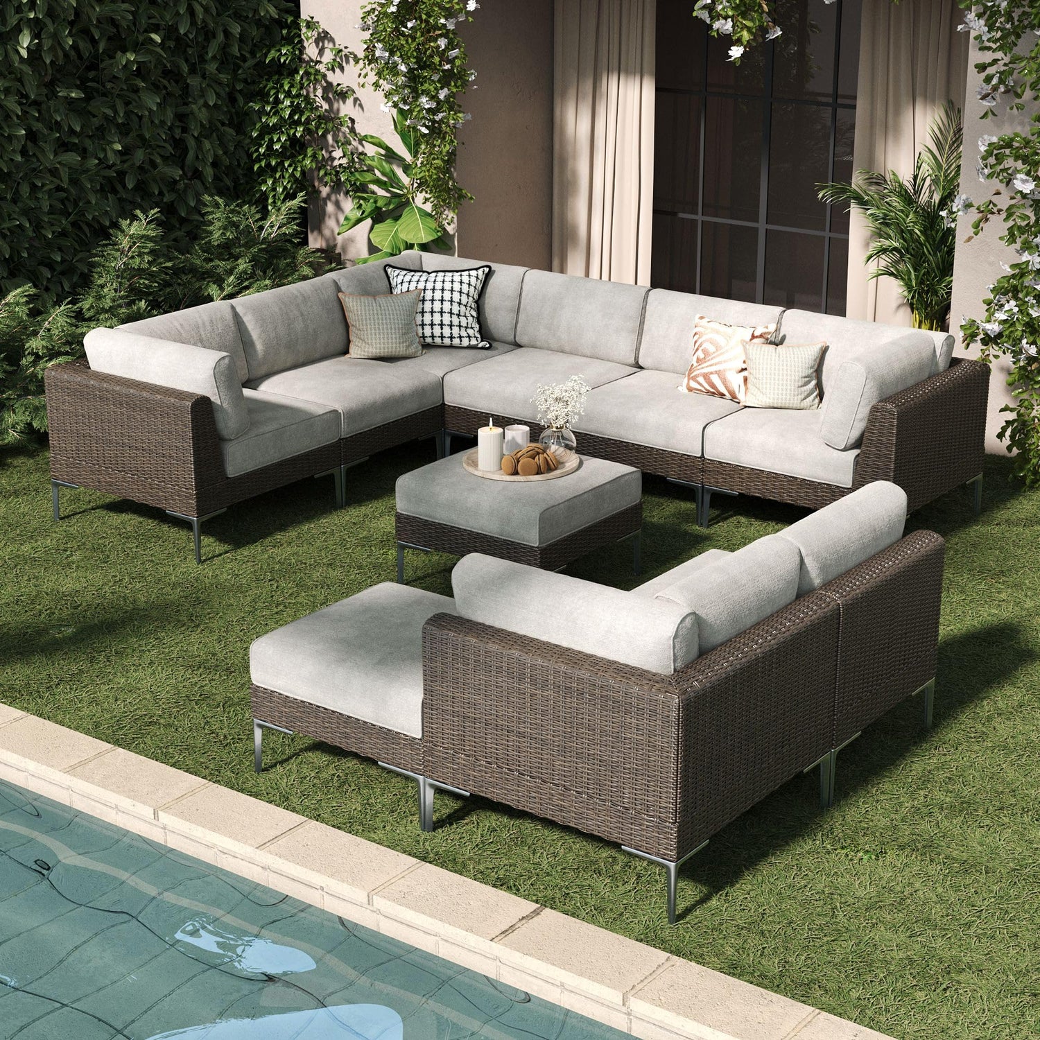 LayinSun 10-Piece Wicker Rattan Patio Furniture Set, Deep Seating Outdoor Modular Sectional Sofa Conversation Set with Thick Cushions for Lawn, Garden