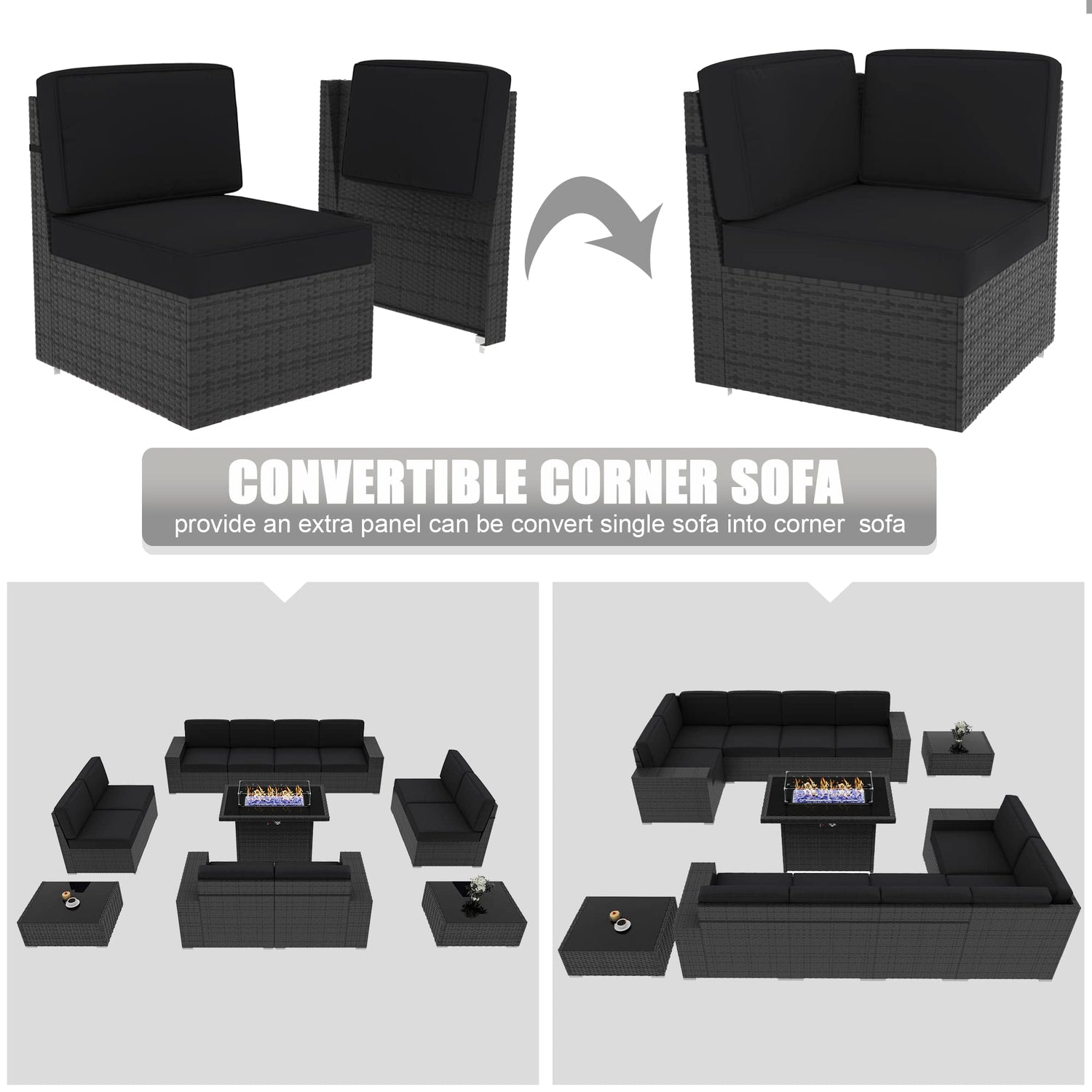 - FLEXIBLE COMBINATION SETTING: 13 pieces outdoor furniture sets come with 2 x Corner Sofas, 4 x Armrest sofa, 4 x Single Sofas, 1 x Fire Pit Table, and 2 x Coffee Table. It allows being pieced together in any combination to suit your needs and match your space
