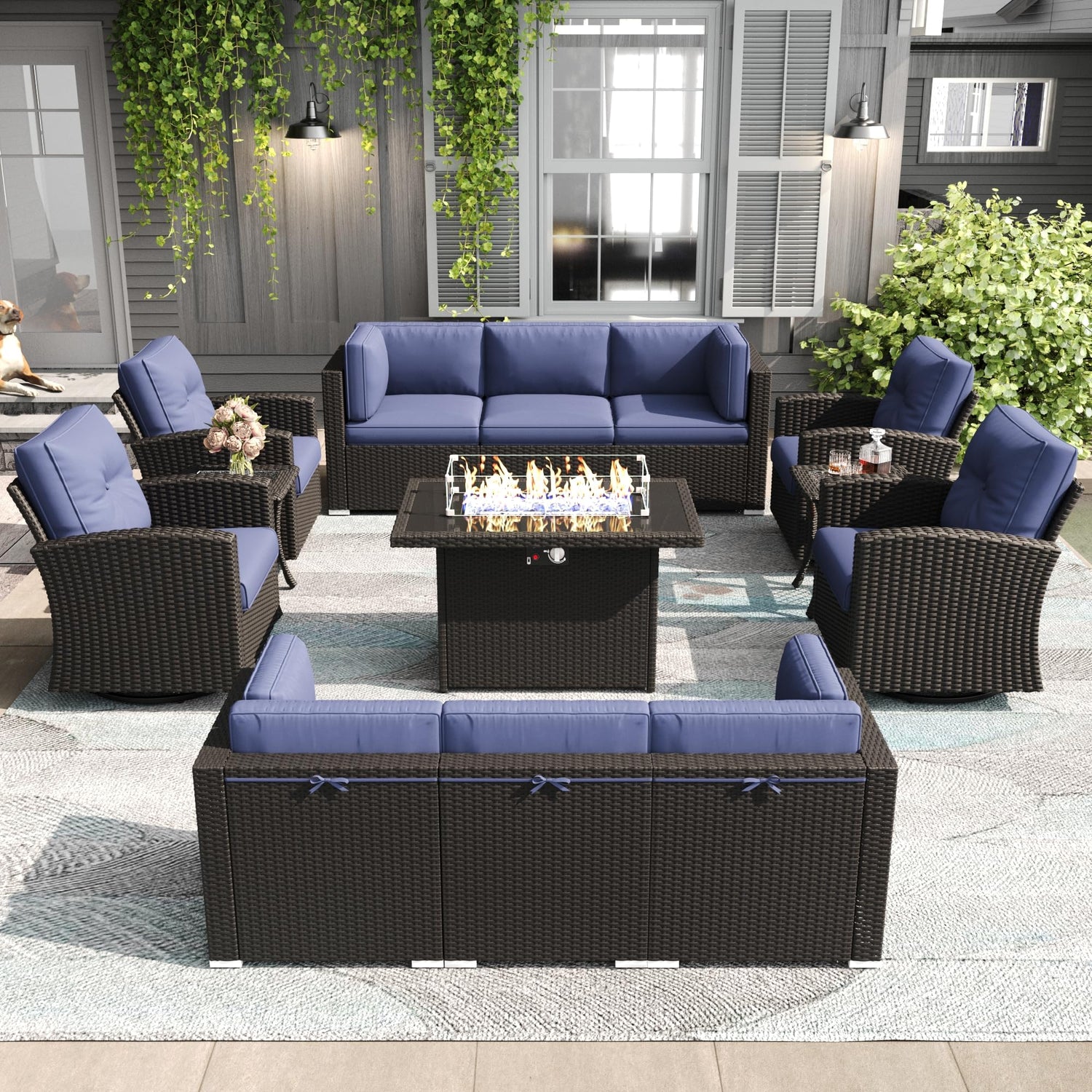 LayinSun 13 Pieces Patio Furniture Set with Fire Pit Table, Black Rattan Modular Sectional Outdoor Conversation Sofa Set, Swivel Rocking Chairs Set