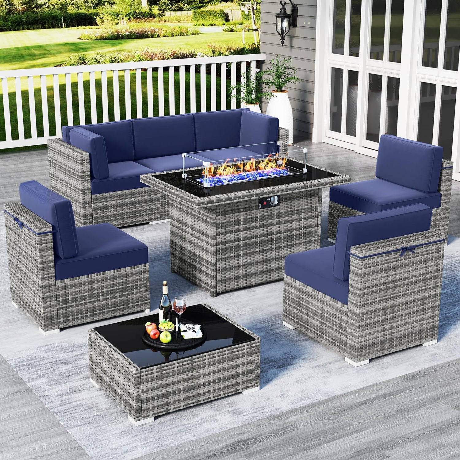 LayinSun 8 Piece Patio Furniture Set with 44" Propane Gas Fire Pit Table, Outdoor Sectional Conversation Set Wicker Rattan Sofa Set with Coffee Table