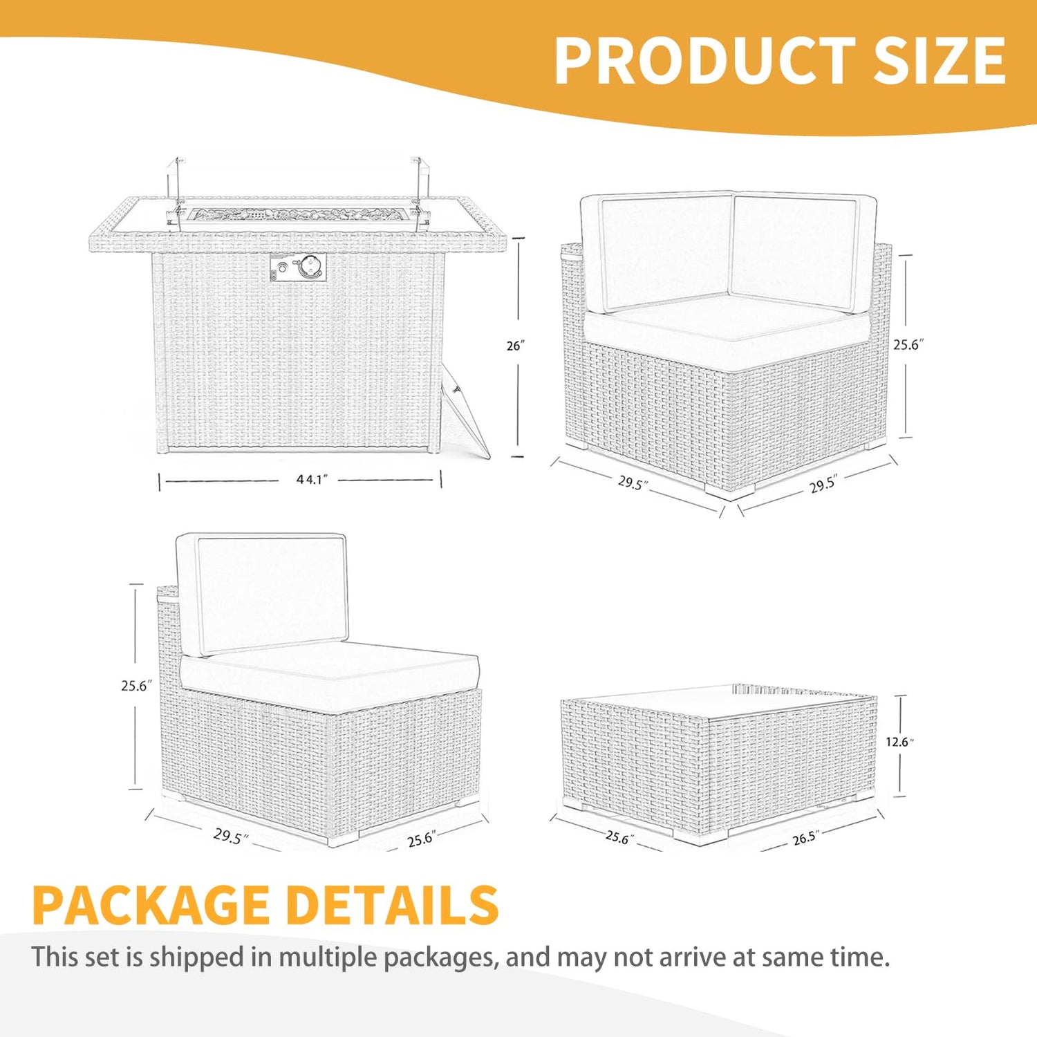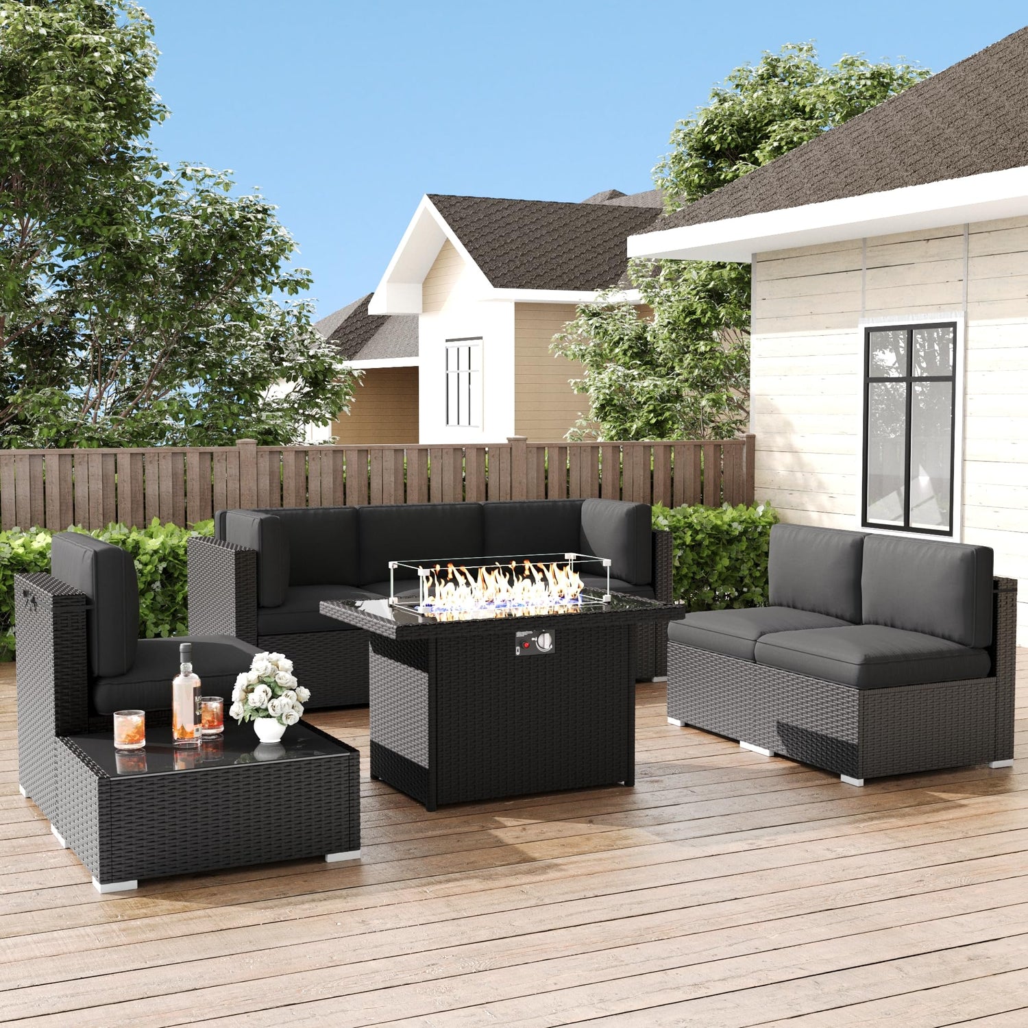 LayinSun 8 Pieces Patio Furniture Set with Fire Pit Table, Black Rattan Modular Sectional Patio Conversation Sofa Set
