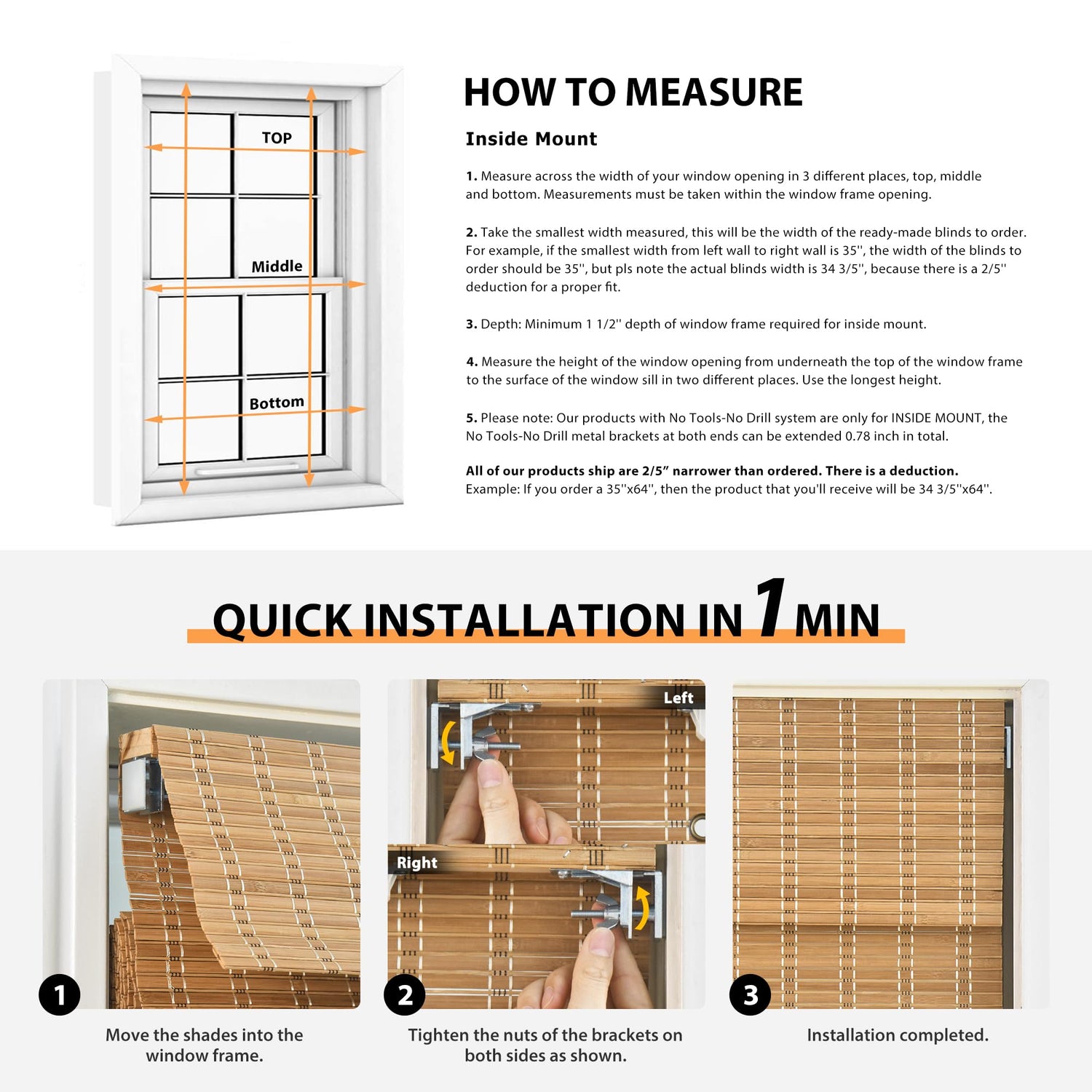 - Blinds are made of 100% Natural bamboo materials, Durable Eco-friendly. Actual item may vary in color from computer monitors colors, Please understand the color difference and bamboo joint on the blinds because of the nature material.