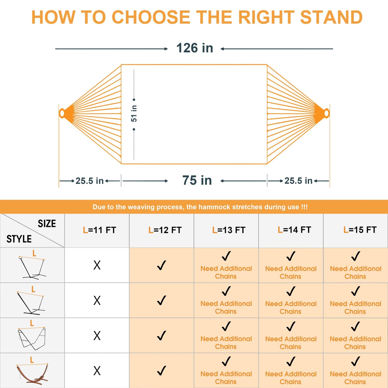 - Adapts to 12-13FT hammock stand: The hammock has an overall length of 126 inches and comes with two chains (each link is 7.4 inches long);Due to the way the hammock is woven, it stretches when in use,so 12-13FT hammock stand is required