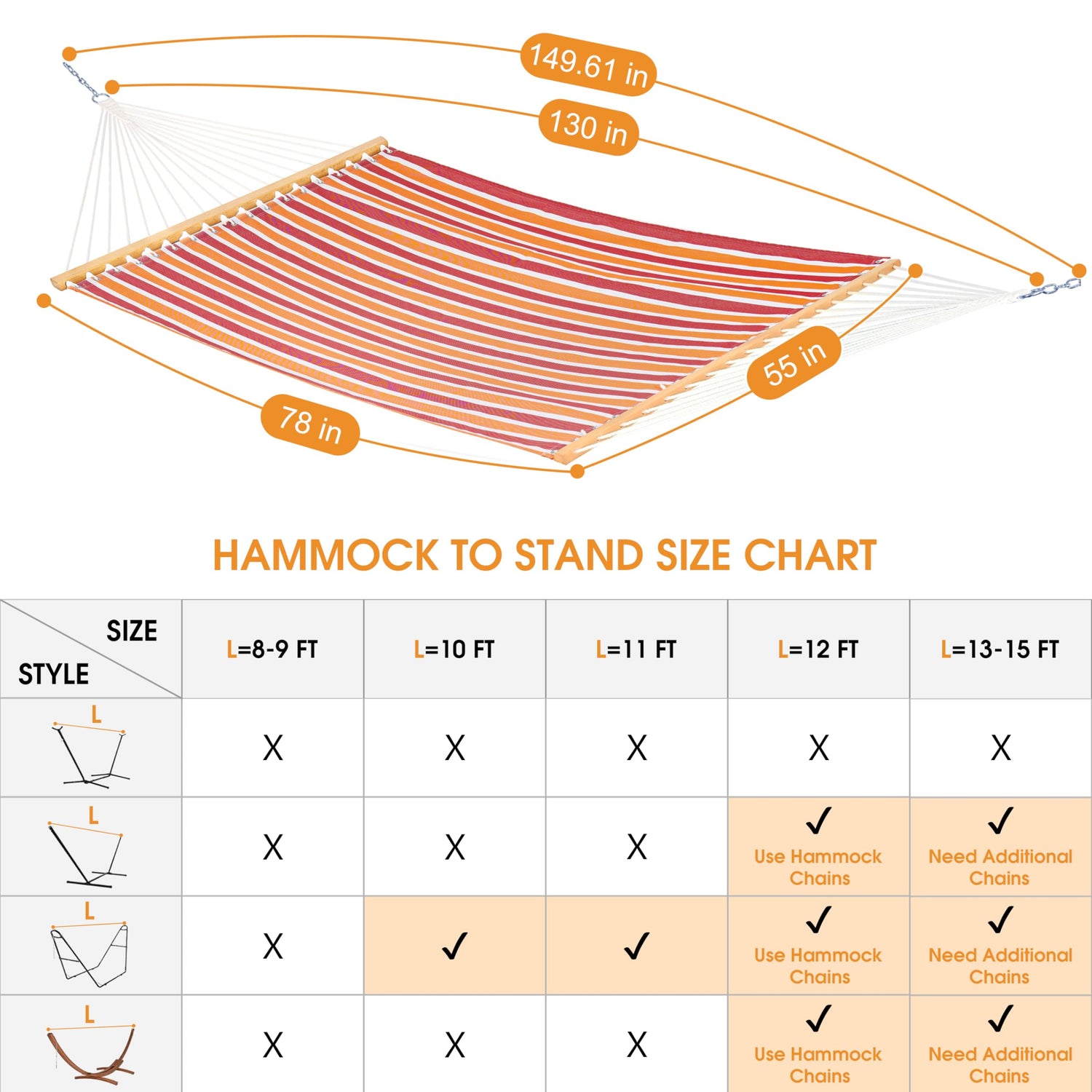 - 2 PERSON HAMMOCK: Lazy Daze Hammocks is large enough to accommodate 2 person. Lazy Daze hammock bed size is 78 inch x 55 inch, The length from ring to ring is 130 inch. With the addition of two 10 inch steel chains, the hammock's total length is 12.5 feet.