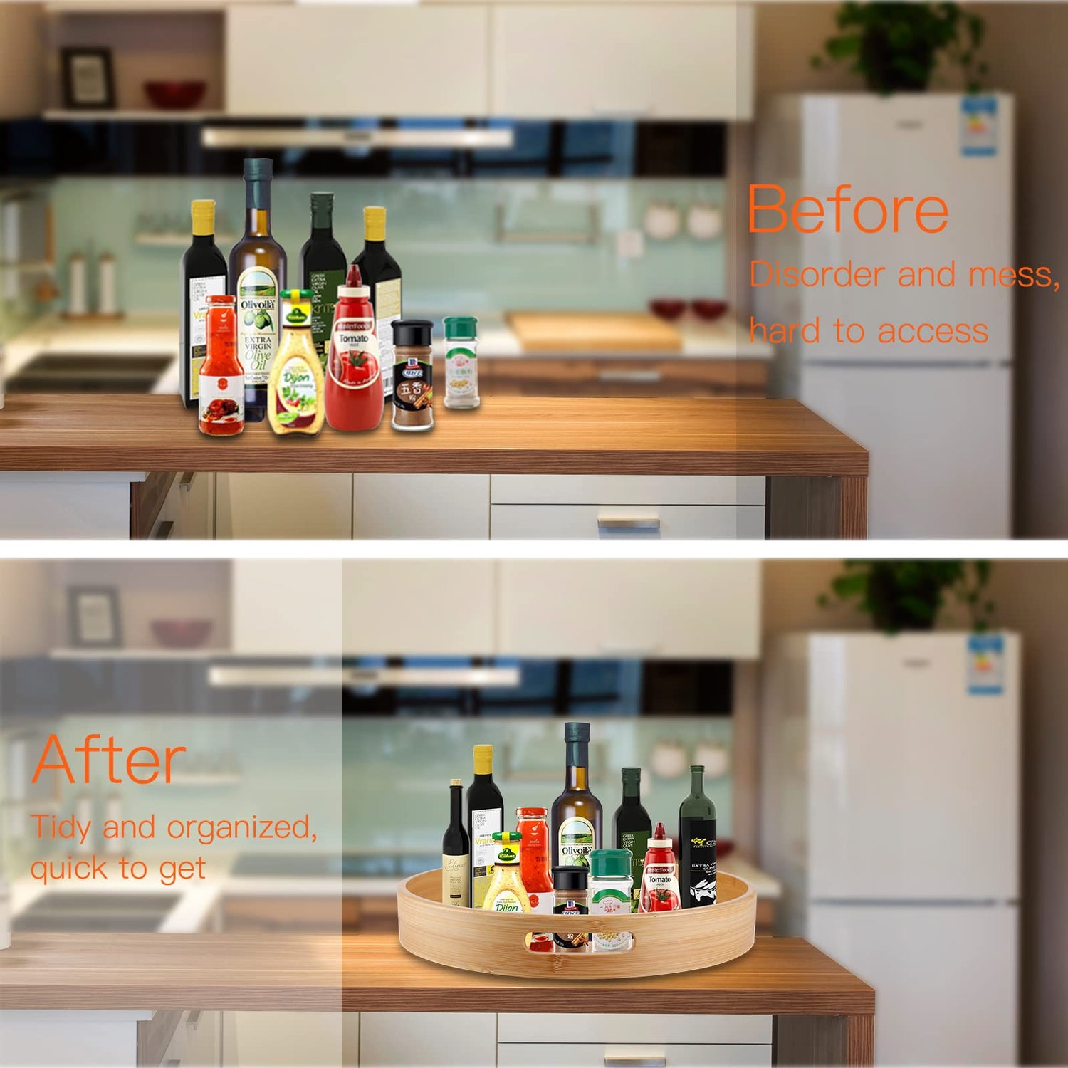 - 【EASY TO REACH】Open design keeps items visible and easily accessible, and the taller lip (height 2") keeps things from falling off the bamboo lazy susan organizer while rotating. Double handles on both sides make kitchen organizer turntable easy to grip and move