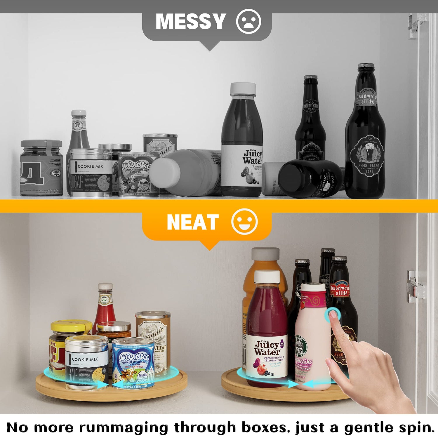 - ✔️【HIGH QUALITY】Lazy susan turntable organizer made of renewable bamboo. Friendly to the environment, has the quality of durable, can simply clean with a damp cloth. The proper size 10" x 10" makes the cabinet, closet, kitchen island, table neat and well-organized.