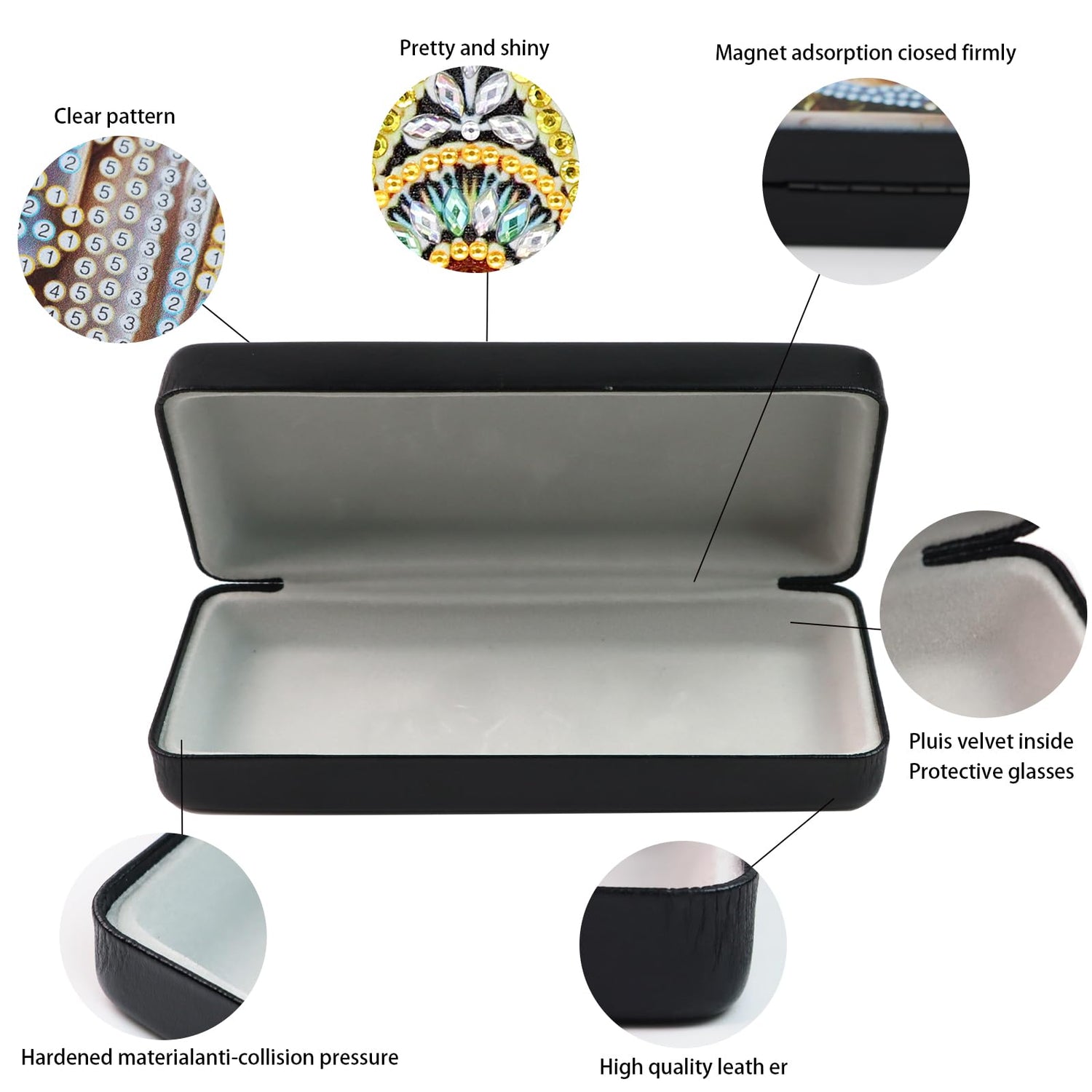- PRODUCTS INCLUDE: 1 x Diamond picture glasses case, 1 x pen, 1 x Tray, Bags of resin gems, 1 x Clay glue