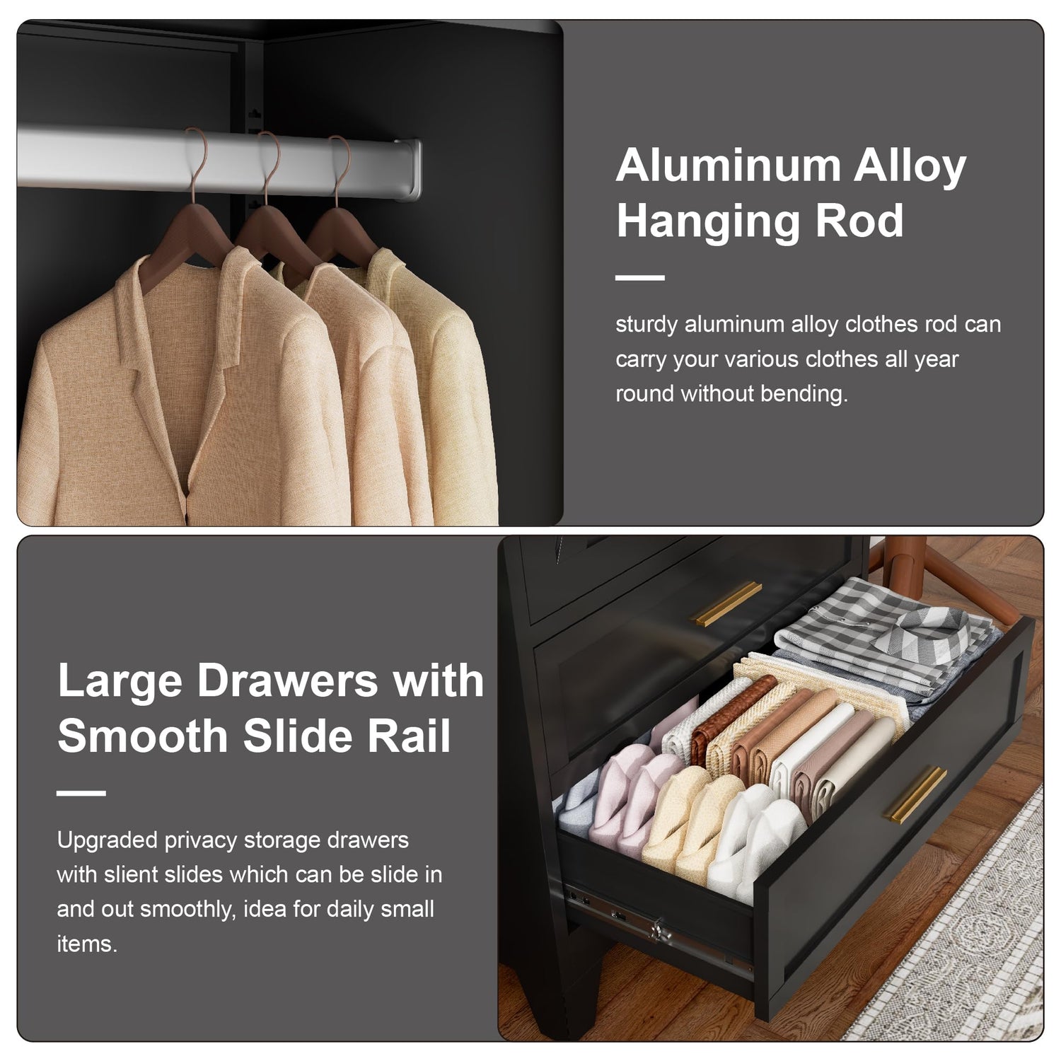 - Convenient Drawers Design: The bedroom armoire includes two spacious drawers at the bottom, providing storage space for smaller items such as underwear, socks, or others. The smooth glide system ensures a hassle-free opening and closing