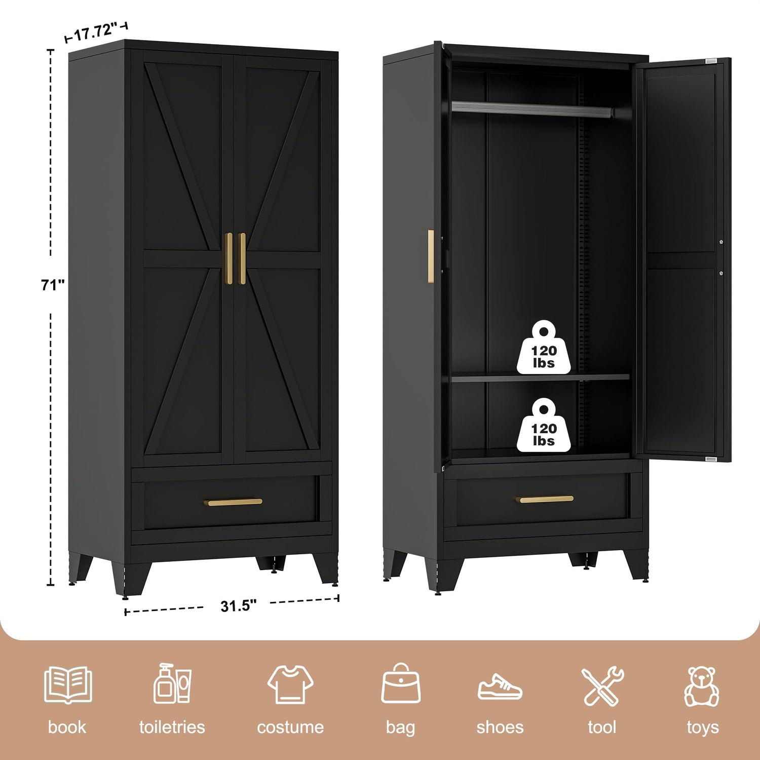 LCAOPC 71" Tall Metal Wardrobe Cabinet with Drawer and Hanging Rod, 2 Doors Armoire Wardrobe Closet with Shelf for Bedroom, Office, Laundry Room, Black