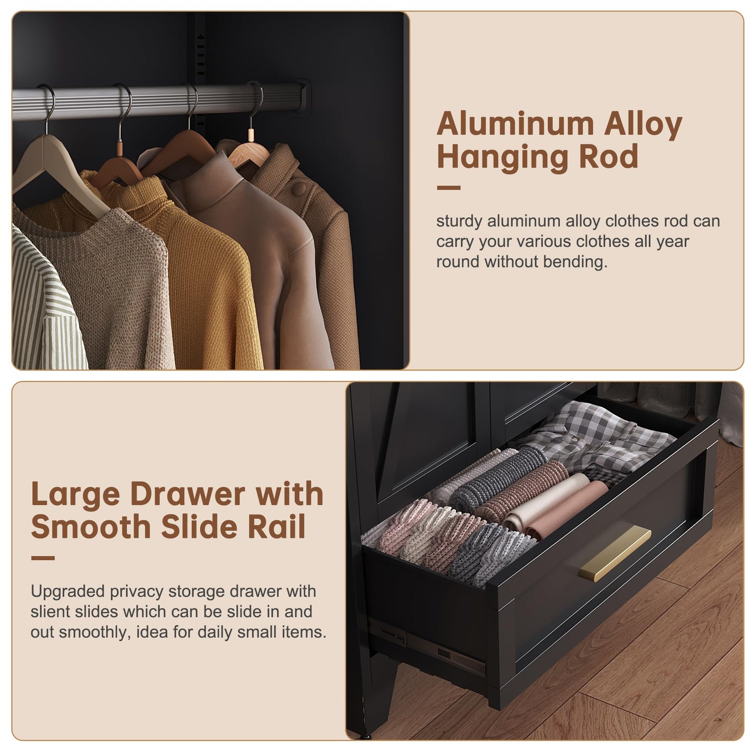 - Convenient Drawer Design: The bedroom armoire includes a spacious drawer at the bottom, providing storage space for smaller items such as underwear, socks, or others. The smooth glide system ensures a hassle-free opening and closing