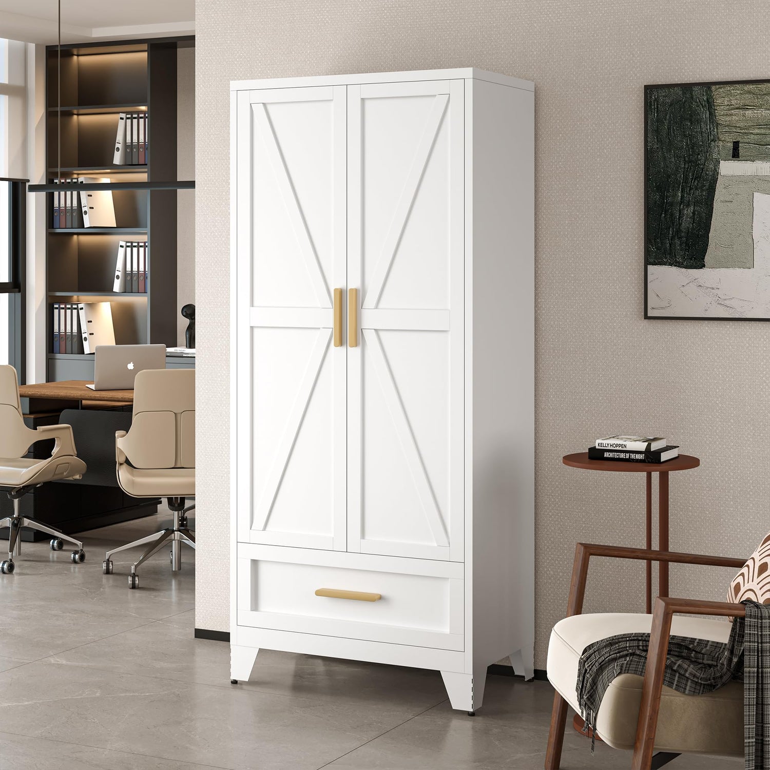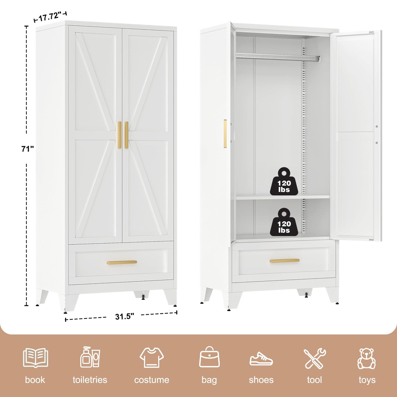 LCAOPC 71" Tall Metal Wardrobe Cabinet with Drawer and Hanging Rod, 2 Doors Armoire Wardrobe Closet with Shelf for Bedroom, Office, Laundry Room, White