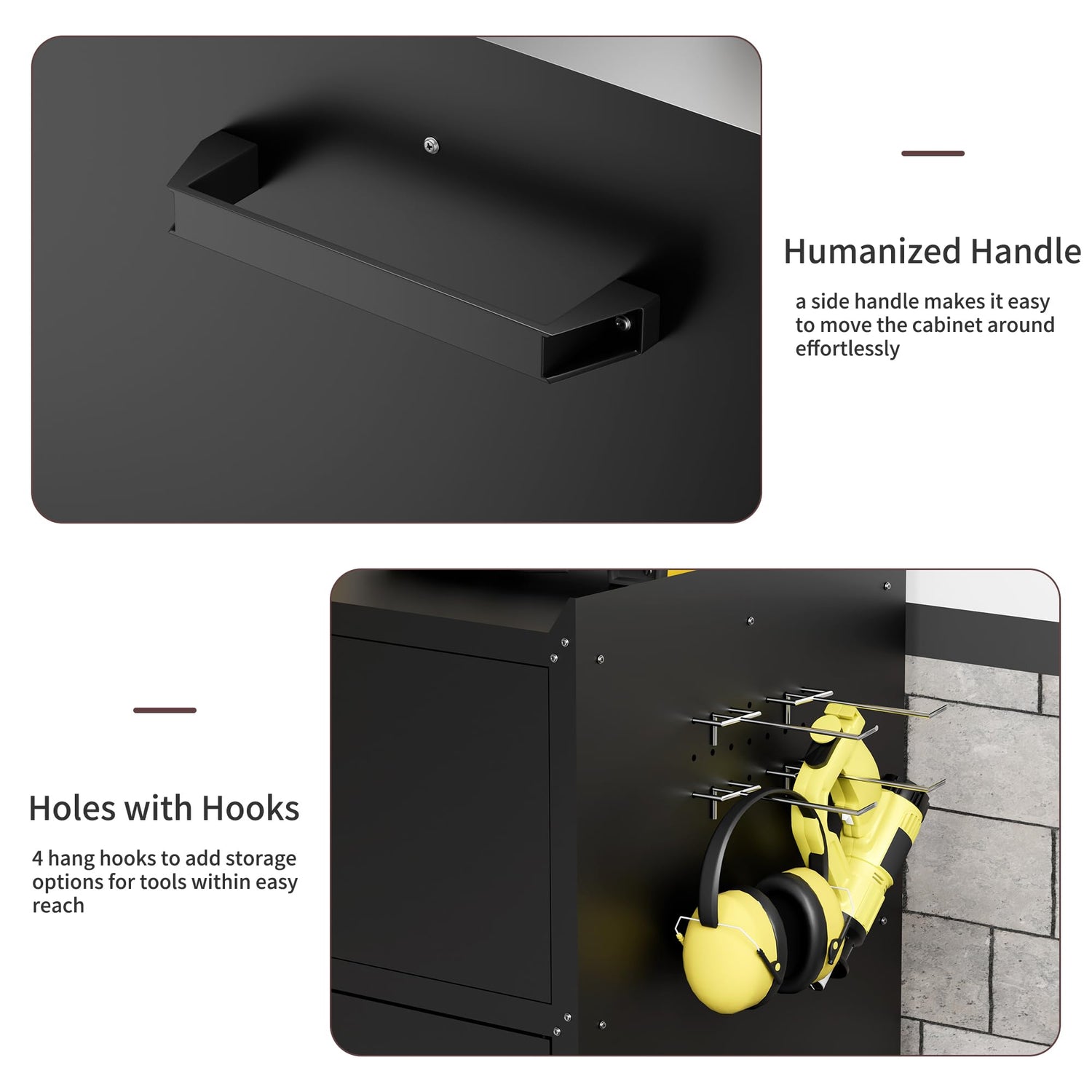 - Versatile Designs: multifunctional holes on the side with four hooks, this rolling tool cabinet allows you to hang extra tools for additional storage space; the three sides guardrils can protect small items on the top from falling down