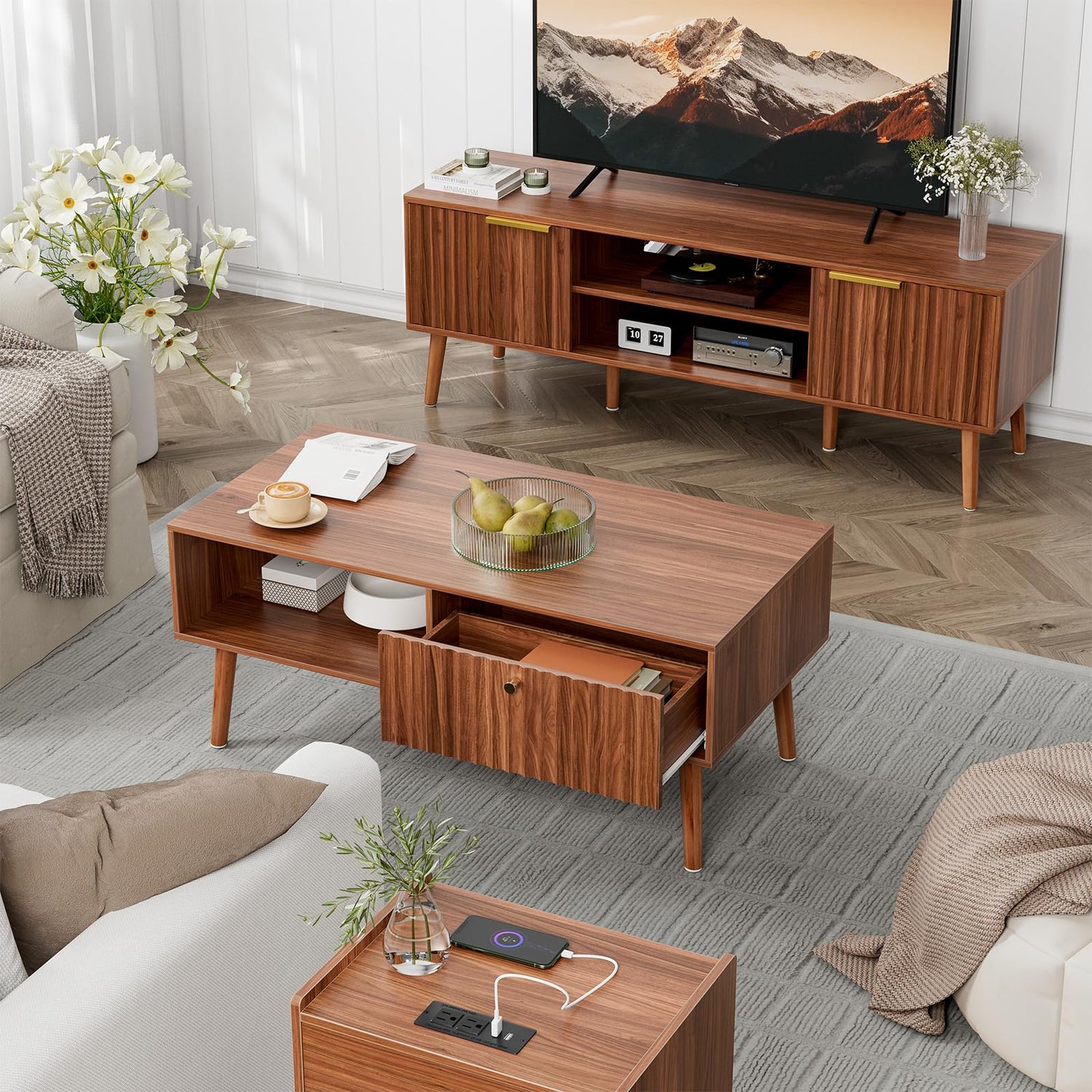 LCRBOL Fluted Coffee Table with Storage, Mid Century Dining Table with Drawer and Solid Wood Legs, Small Coffee Tables for Living Room, Walnut