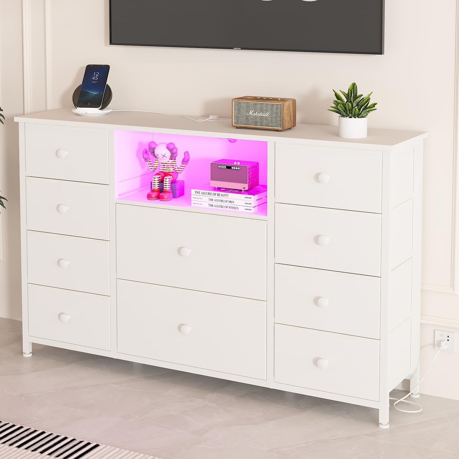 LDTTCUK Dresser with Charging Station and LED Lights, Long Dresser for Bedroom Dresser TV Stand with 10 Drawers, Fabric Chest of Drawers with PU Finish, Wide Dresser Storage Organizer, White