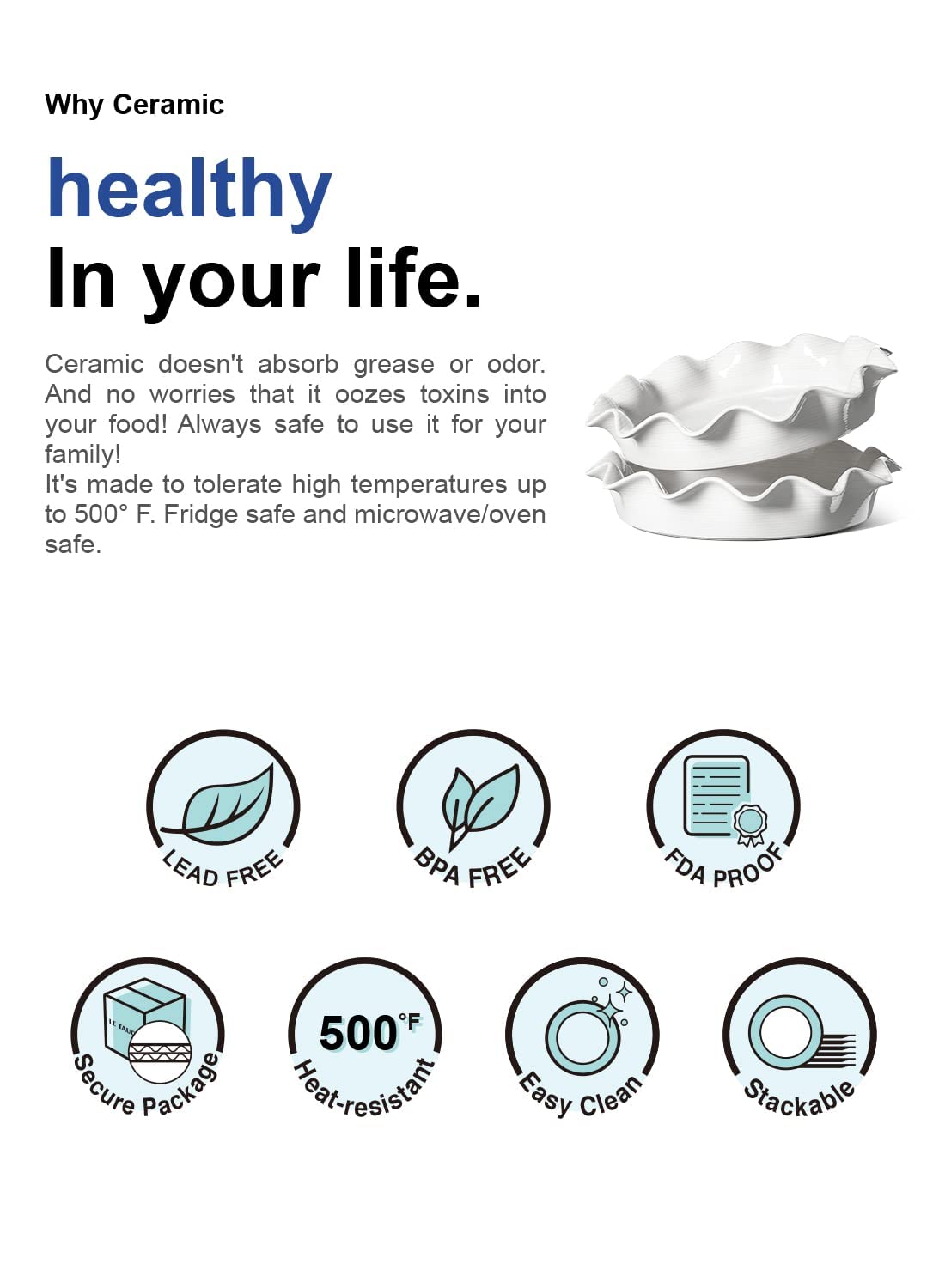 - Healthy Choice: The ceramic pie dish elevates pie baking from ordinary to art as it evenly distributes the heat during baking; Durable for everyday use; The highly resistant glaze does not absorb food odors or flavors