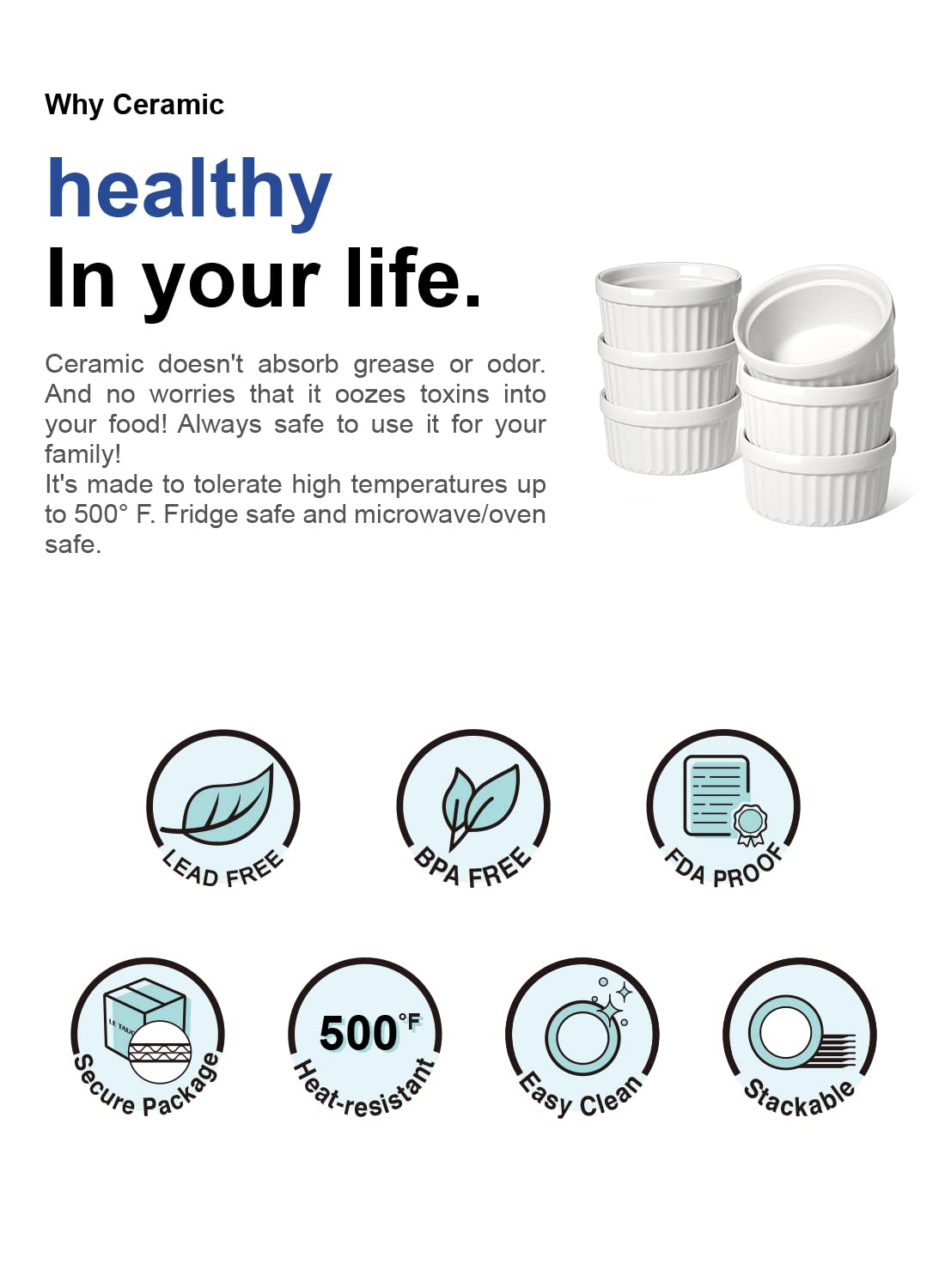 LE TAUCI Ramekins 4 OZ Oven Safe, Creme Brulee Ramekins, Pudding Custard Cups Souffle Ramiken, Dipping Sauce Dishes, Ceramic Ramekin Bowls Set of 6, White