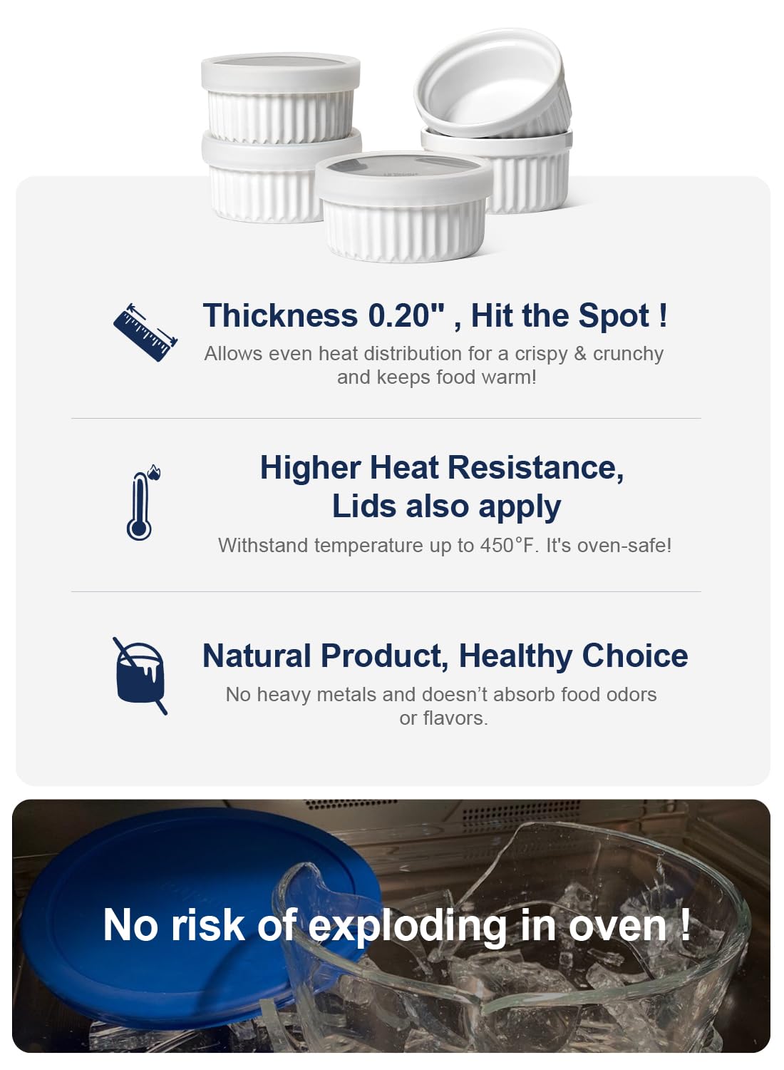 - Perfectly Sized for Versatility: Measuring 4.3" wide x 2.1" tall with a 8 oz capacity (10 oz to the brim), our ramekins with lids are perfect for individual servings like creme brulee, souffles, chocolate mousse, baked eggs, quiches, and more. Endless possibilities for both sweet and savory dishes