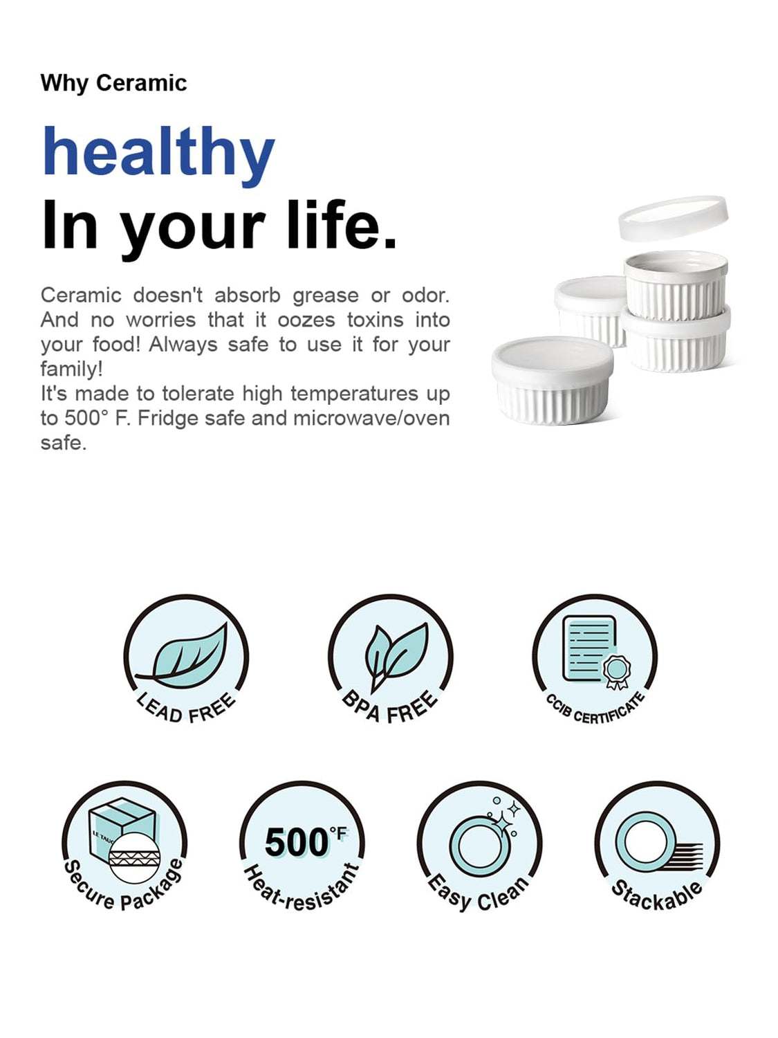 - Premium Ceramic, Safe and Durable: Crafted from high-quality, food-safe porcelain and fired at high temperatures, these ramekins 8 oz ensure unmatched durability and safety. Freezer, microwave, and oven-safe (up to 450°F), they seamlessly transition from cooking to serving. Unlike plastic or metal, ceramic is free of heavy metals, resists odors and flavors, and guarantees no harmful substances leach into your food. Note: Leave the lid slightly open when heating